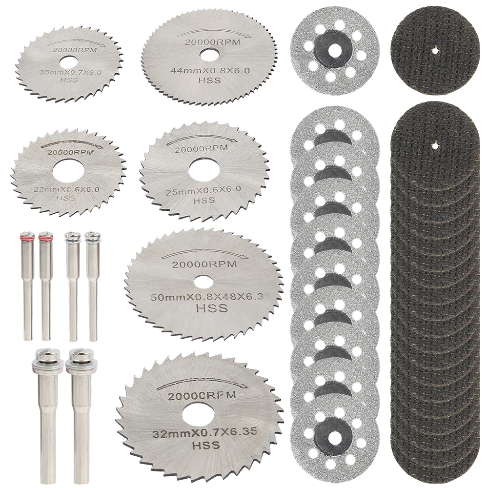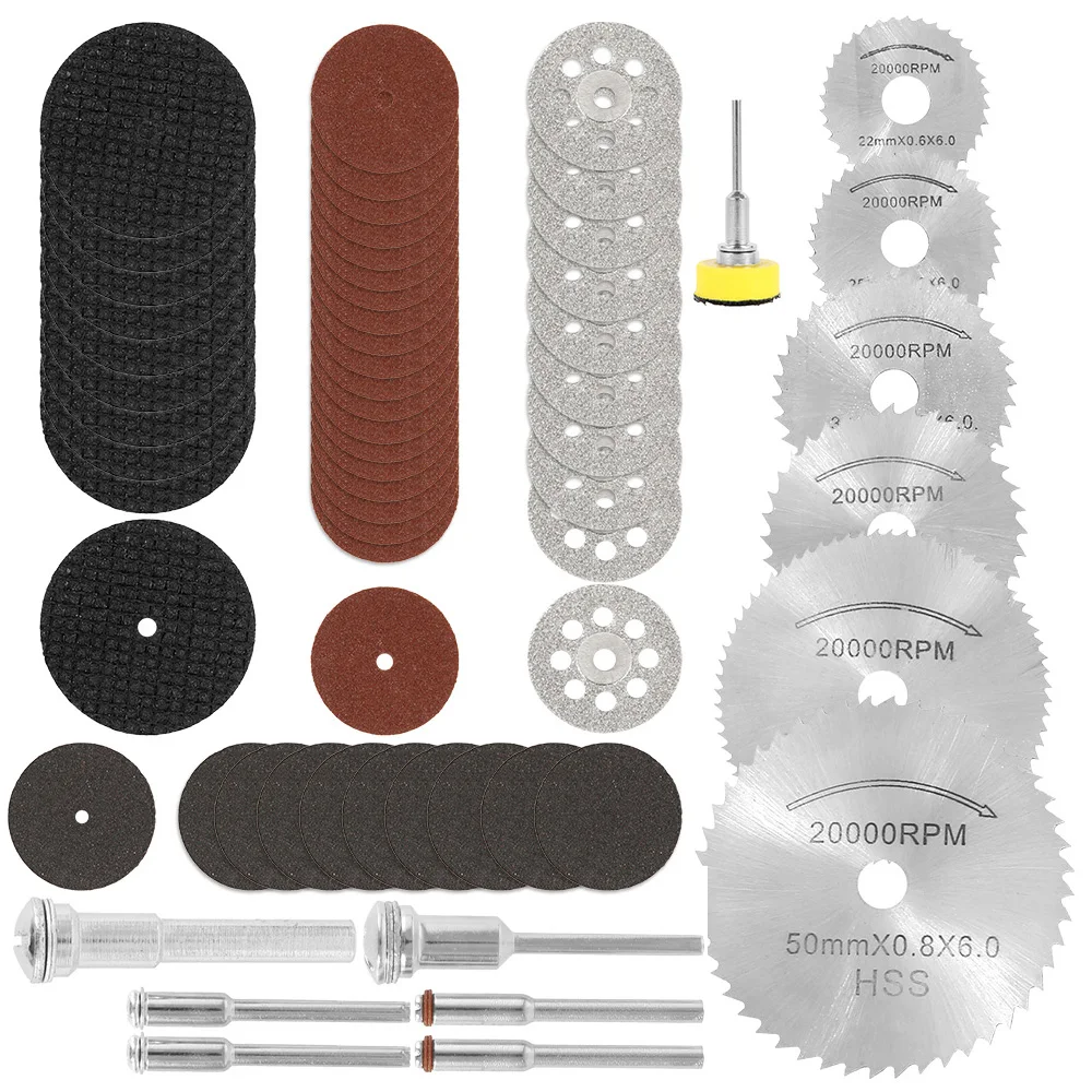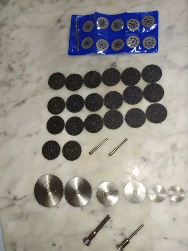 В комплекте: пильный диск 5 шт, алмазный шлифовальный диск 10 шт, стержень 6 шт., режущий диск 10 смола