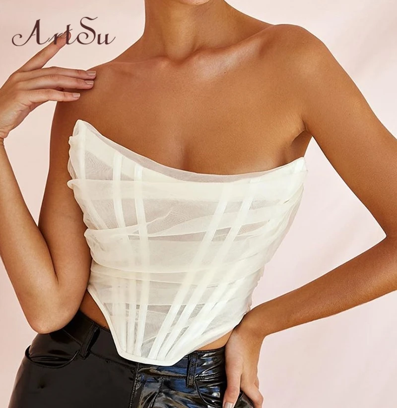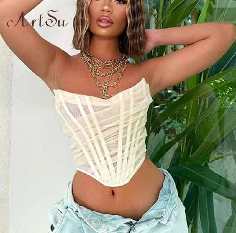 Artsu, без рукавов, сетка, на шнуровке, с открытыми плечами, бюстье, корсет, кроп, без бретелек, топы, женские топы с вырезом на спине, на молнии, лето 2020