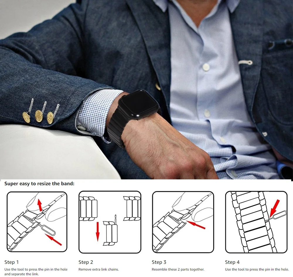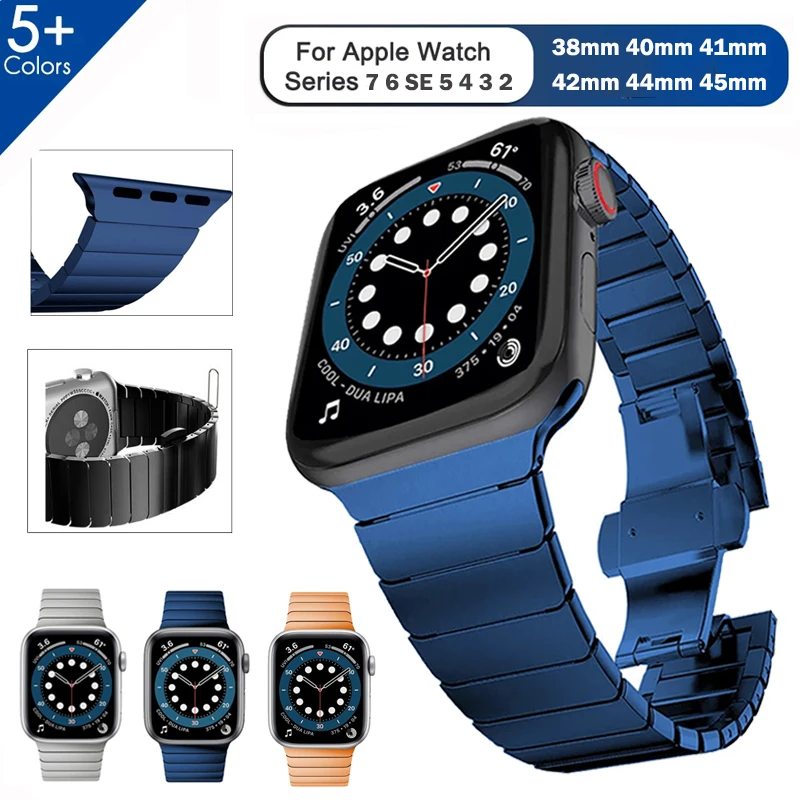 Характеристики продукта:1. Размер: для Apple Watch 38 мм 42 мм 40 мм 44 мм 41 мм 45 мм2. Материал: изготовлено из качественной нержавеющей стали и полировки путем предварительной обработки поверхности, обеспечивает блестящую поверхность, гладкое прикосновение и долговечность. Краски не стираются легко.3. Дизайн: каждая деталь ремешка Apple Watch, подходит для тренировок, деловых случаев и повседневной носки.4. Безопасный замок: ремешок с застежкой дизайн с двойной кнопкой, обеспечить полосу блокировки безопасности. Изысканные разъемы из нержавеющей стали блокируют ваши часы5. В комплект входит:1 * для apple watch band (не включает часы)