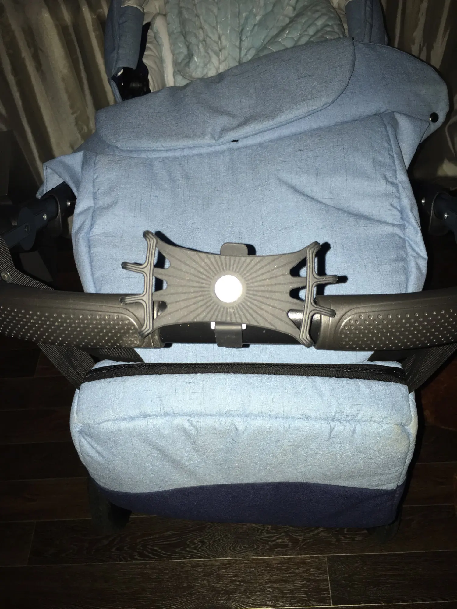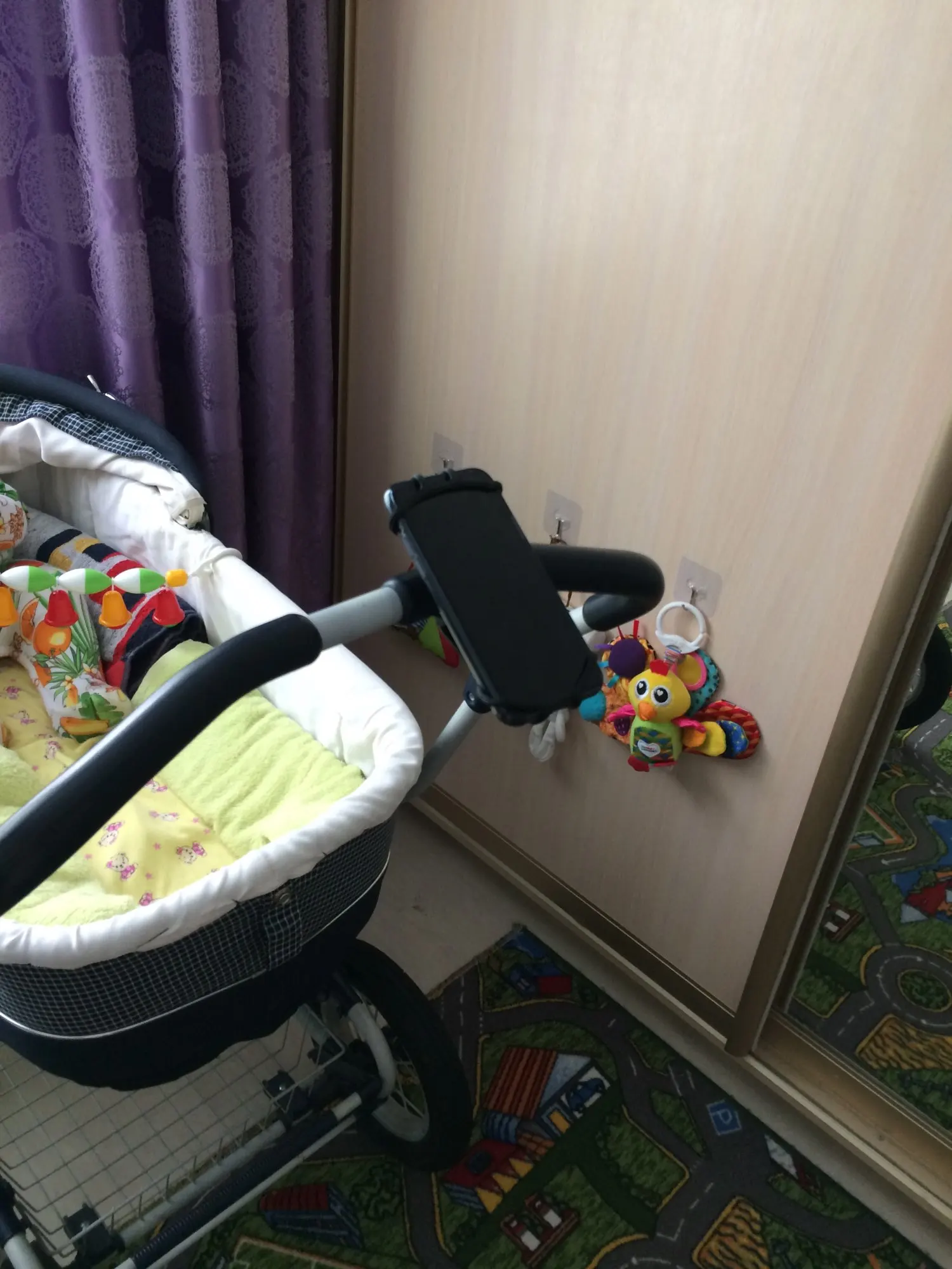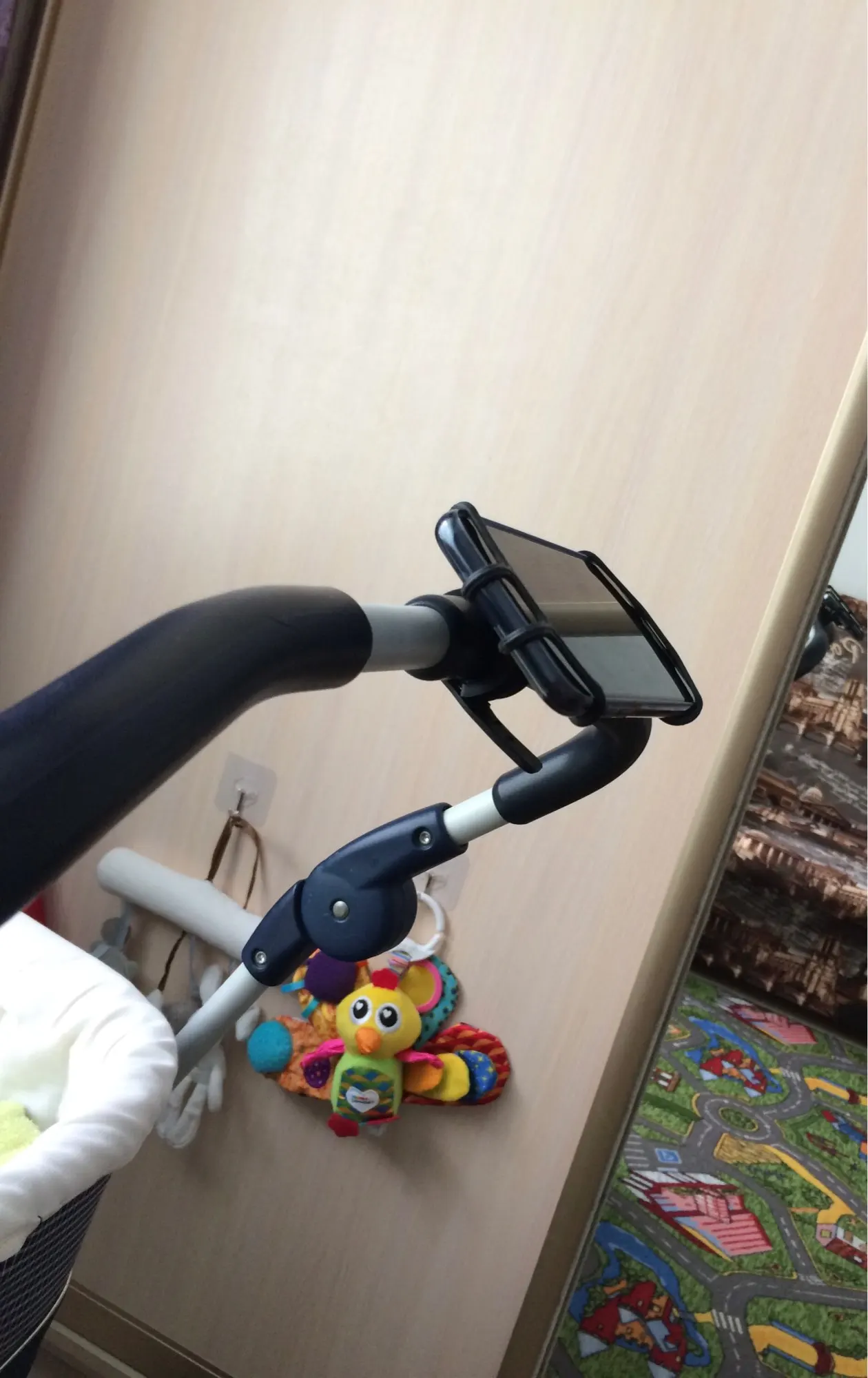 Хорошо держится на рукоятки коляски, телефон плотно прижат