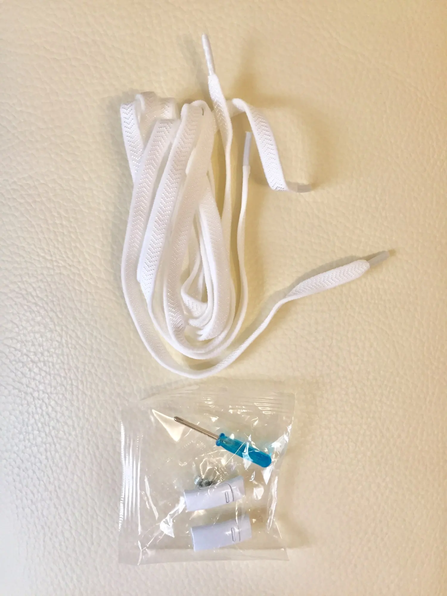 Igual que en anuncio. El destornillador es muy pequeño, pero funcional y vienen 2 tornillos de repuesto. Los cordones son elásticos y las hebillas fáciles de instalar. Muy cómodos y contenta con la compra.