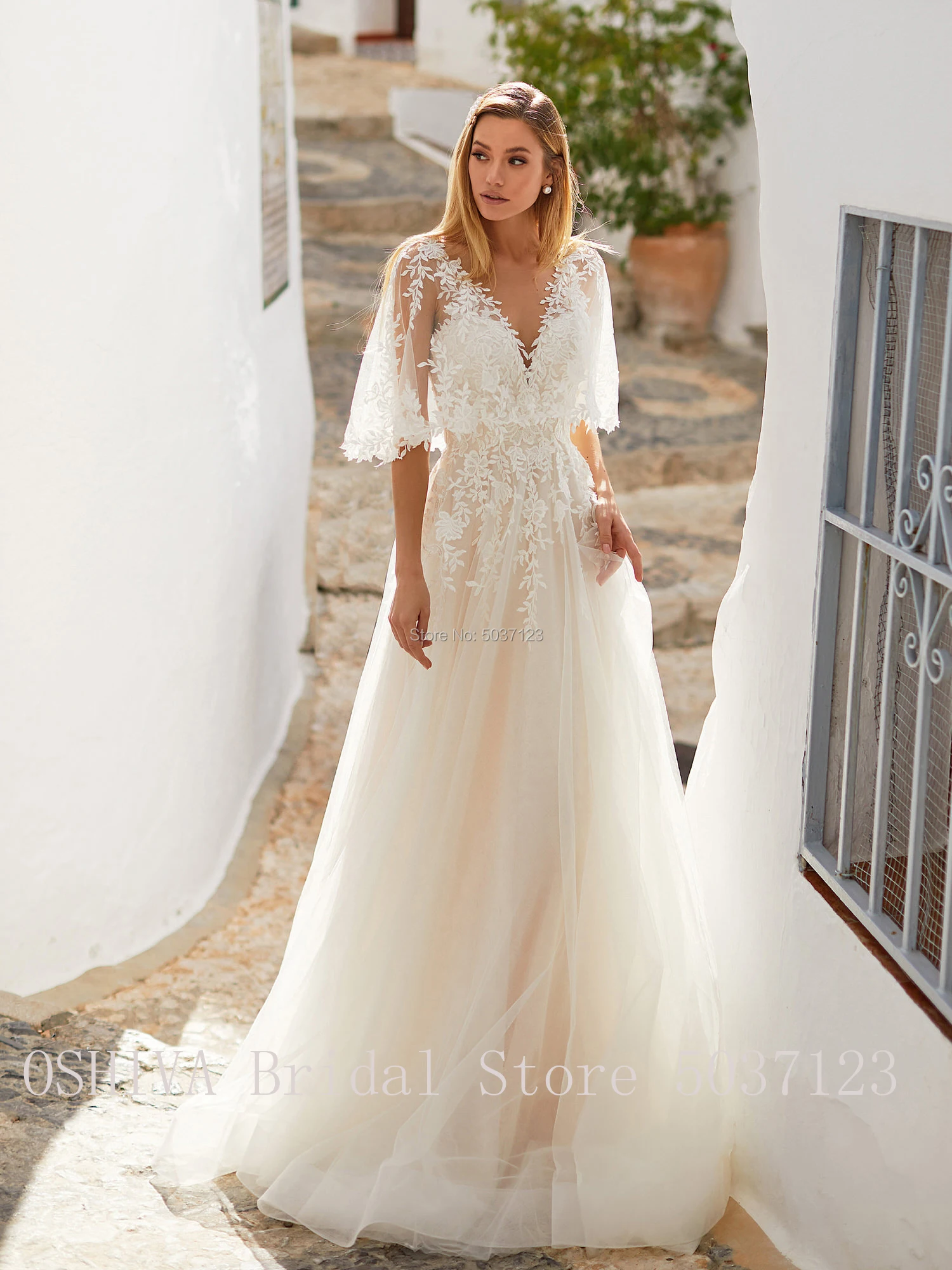 Шикарные кружевные платья цвета шампанского с аппликацией и двойным V-образным вырезом светильник кие Свадебные платья с расклешенными рукавами, трапециевидные свадебные платья в стиле бохо