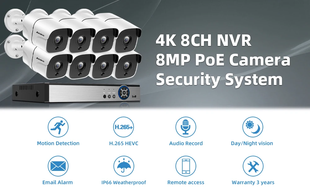 1. Все наши сетевые видеорегистраторы являются реальными H.265 4K 8MP, сетевой видеорегистратор может поддерживать 8MP и 4K max, вы можете подключить 720p,1080p,3mp,4mp ,5mp, камеры 8 МП и 4k с нашим видеорегистратором POE;2. Наш сетевой видеорегистратор поддерживает распознавание лиц, интеллектуальное воспроизведение лиц, обеспечивает видеоизображение сверхвысокой четкости, обеспечивая максимальную детализацию и четкость;3. Наш сетевой видеорегистратор и камеры поддерживают расширенное Сжатие видео H.265, питание через Ethernet,Plug and play, простота в использовании;4. Все камеры оснащены встроенным микрофоном, поддерживающим запись звука и дневное ночное видение Ultra HD;5. Все камеры изготовлены из металлического материала, IP66 водонепроницаемы, подходят для внутреннего и наружного применения, надежная безопасность дома;6. Поддержка обнаружения движения, оповещения по электронной почте, воспроизведения видео и нескольких языков;7. Поддержка Android,Iphone,Ipad, ПК, VMS,P2P view;8. Удаленный доступ в любом месте и в любое время;