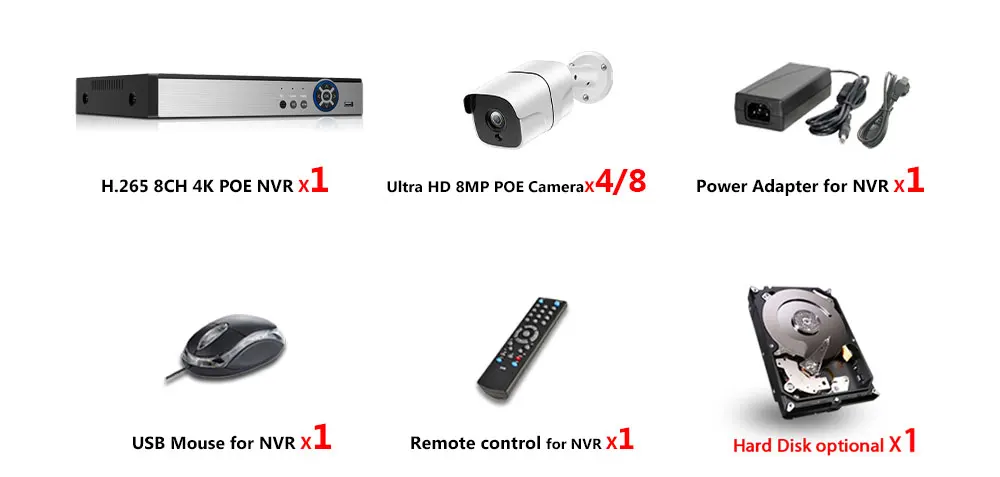 1 X 8-канальный сетевой видеорегистратор 4K POE NVR;4/8 X HD POE IP 8 Мп, Наружные камеры дневного и ночного видения с защитой от атмосферных воздействий;1 блок питания для сетевого видеорегистратора;1 USB-мышь для сетевого видеорегистратора;1 компакт-диск с программным обеспечением для сетевого видеорегистратора;1 х пульт дистанционного управления для сетевого видеорегистратора;Жесткий диск опционально!