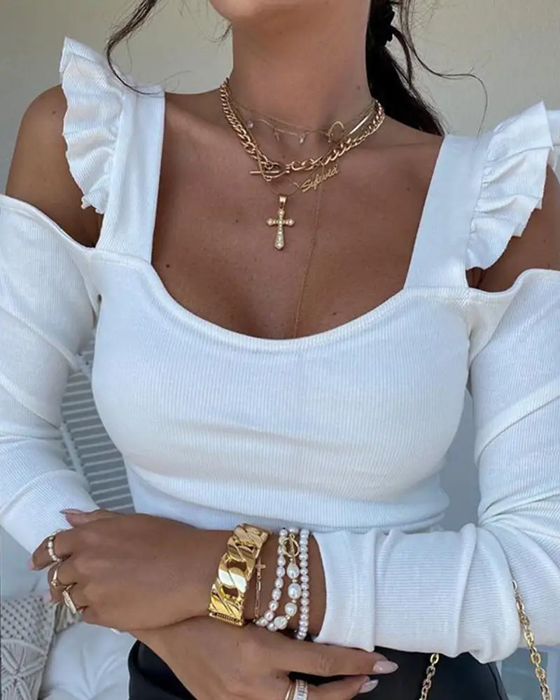 С открытыми плечами и оборкой однотонная блуза Топы с длинными рукавами и квадратным вырезом Женская сексуальные вершины
