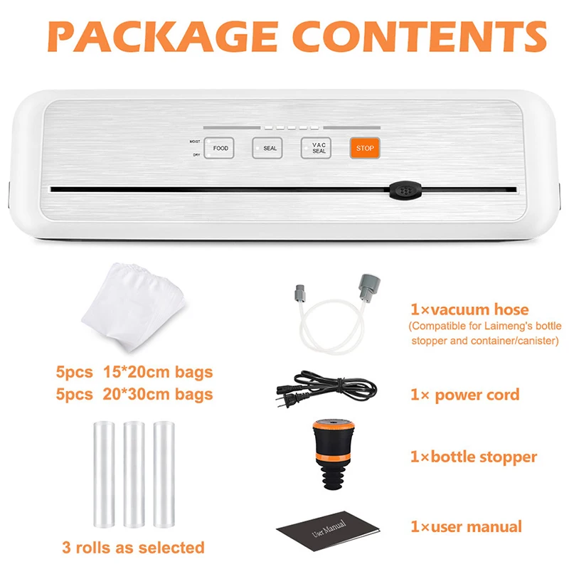 1x вакуумный упаковщик, 5 вакуумных пакетов (15*20 см), 5 вакуумных пакетов (20*30 см), 3 вакуумных рулона как выбрано, 1x вакуумный шланг, 1x пробка для бутылок, 1x шнур питания, 1x Руководство пользователя на английском языке