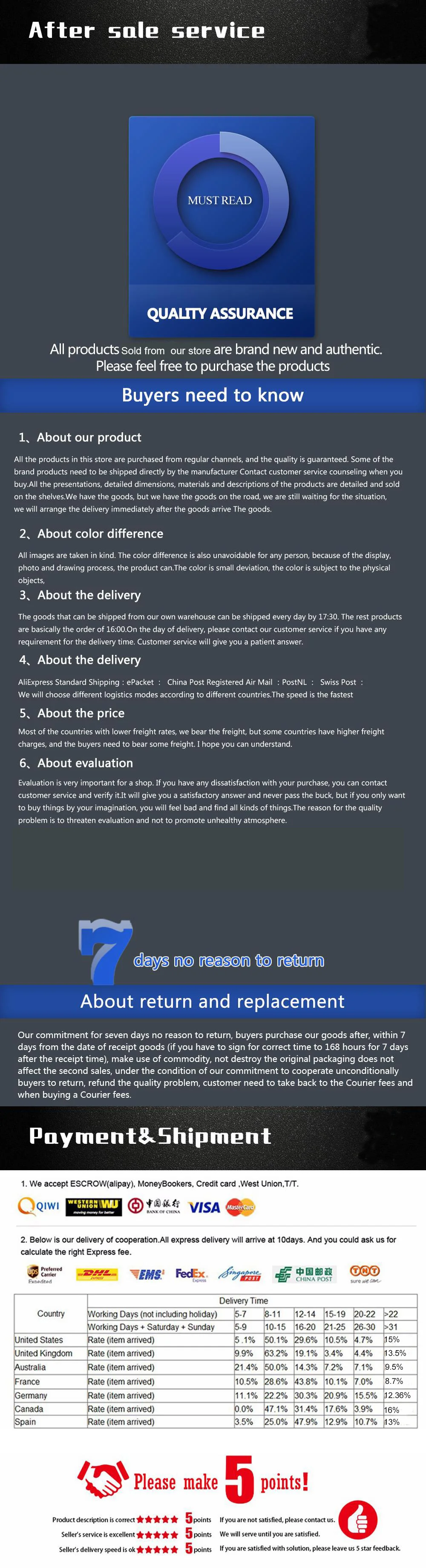Promise:1. Delivery within 2 days.2. Products have any quality problems, please contact us from Aliexpress message, We will resolve for you.3. If you didn't receive the product, free resend or full refund.
