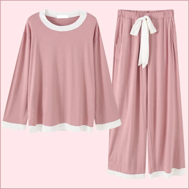 Женский пижамный комплект CAIYIER, розовый пижамный комплект с круглым вырезом, Длинный топ и брюки с бантом, свободная Ночная сорочка