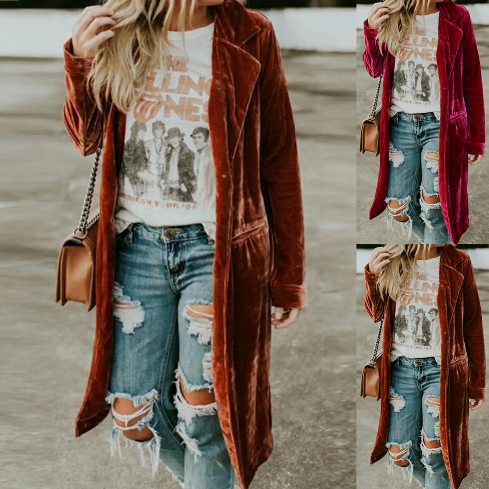 Осенне-зимнее женское однотонное пальто с длинным рукавом, бархатная миди куртка с карманами, бархатная миди куртка с карманами