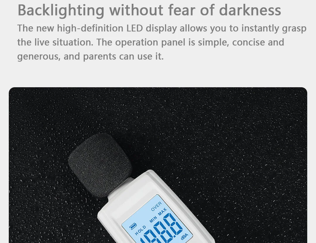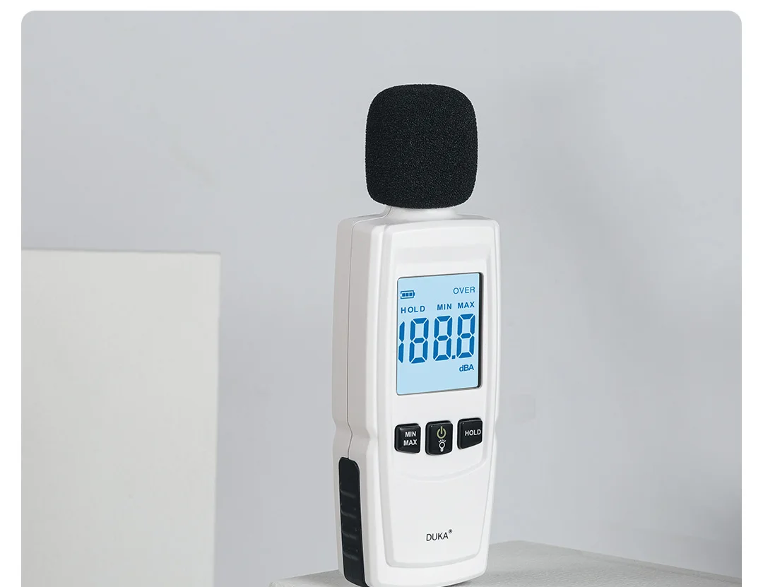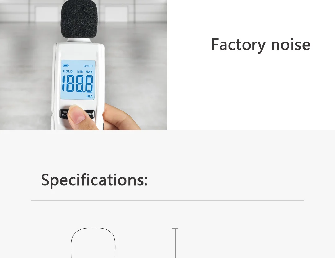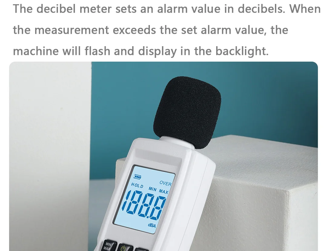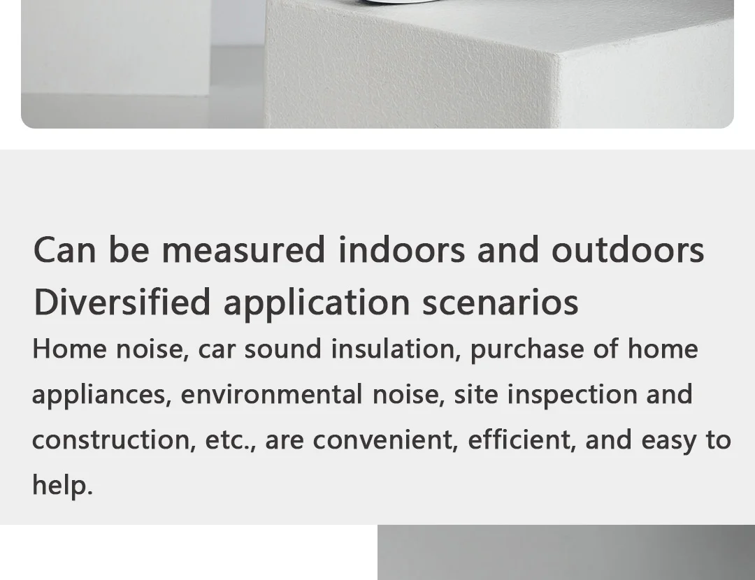 Внешний вид Цифровой измеритель уровня звука является новым, компактным и удобным. Подходит для шумоизоляции, контроля качества, профилактики здоровья и различных измерений уровня шума окружающей среды. Измерение уровня шума в различных местах, таких как фабрики, офисы, дорожные дороги, дома и аудио.