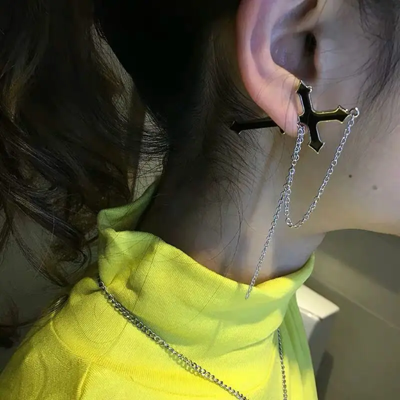 Серьги-каффы в стиле панкхип-хоп, ювелирные украшения для пирсинга с шипами, на длинной цепочке, с крестом, 1 шт.