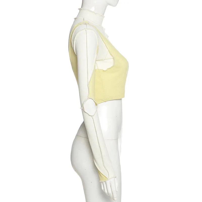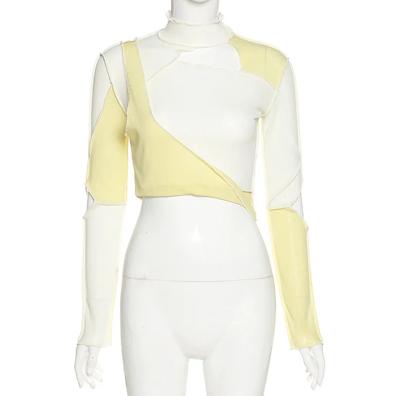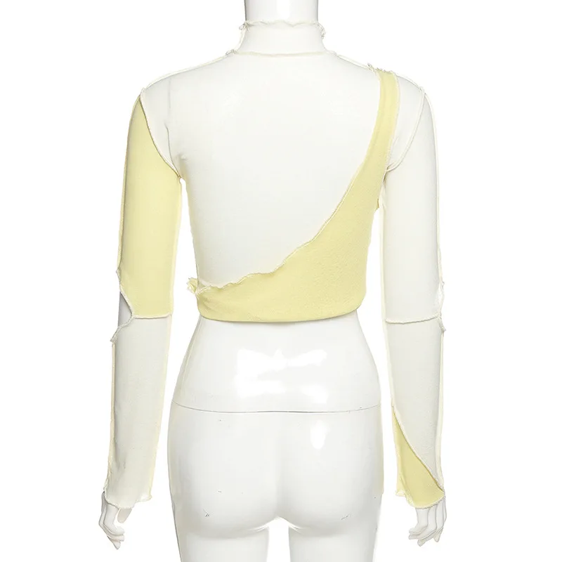 Милая Сексуальная крутая женская футболка в стиле пэчворк, облегающий клубный Модный укороченный Топ с длинным рукавом и высоким воротником для девушек, уличная одежда