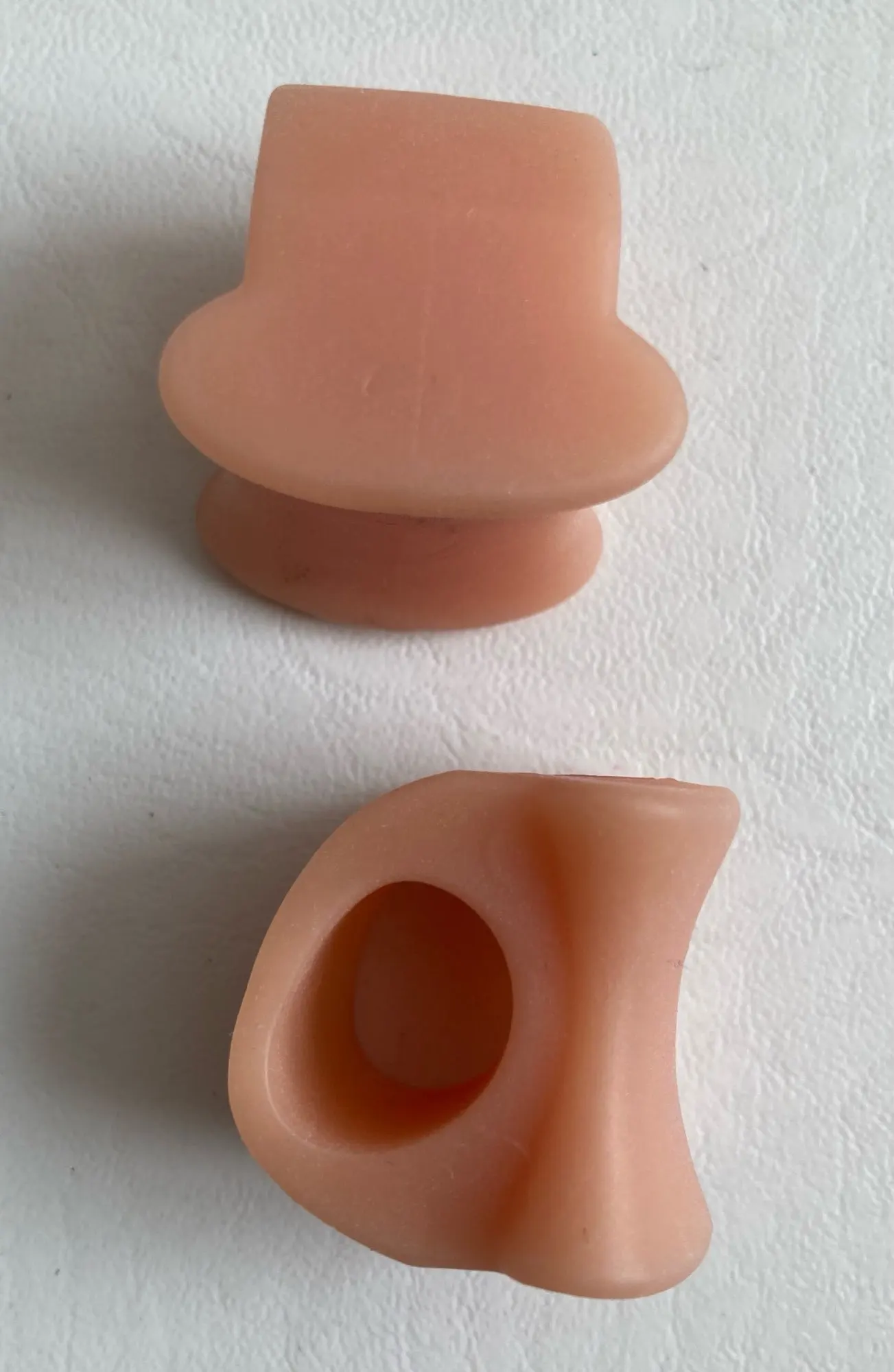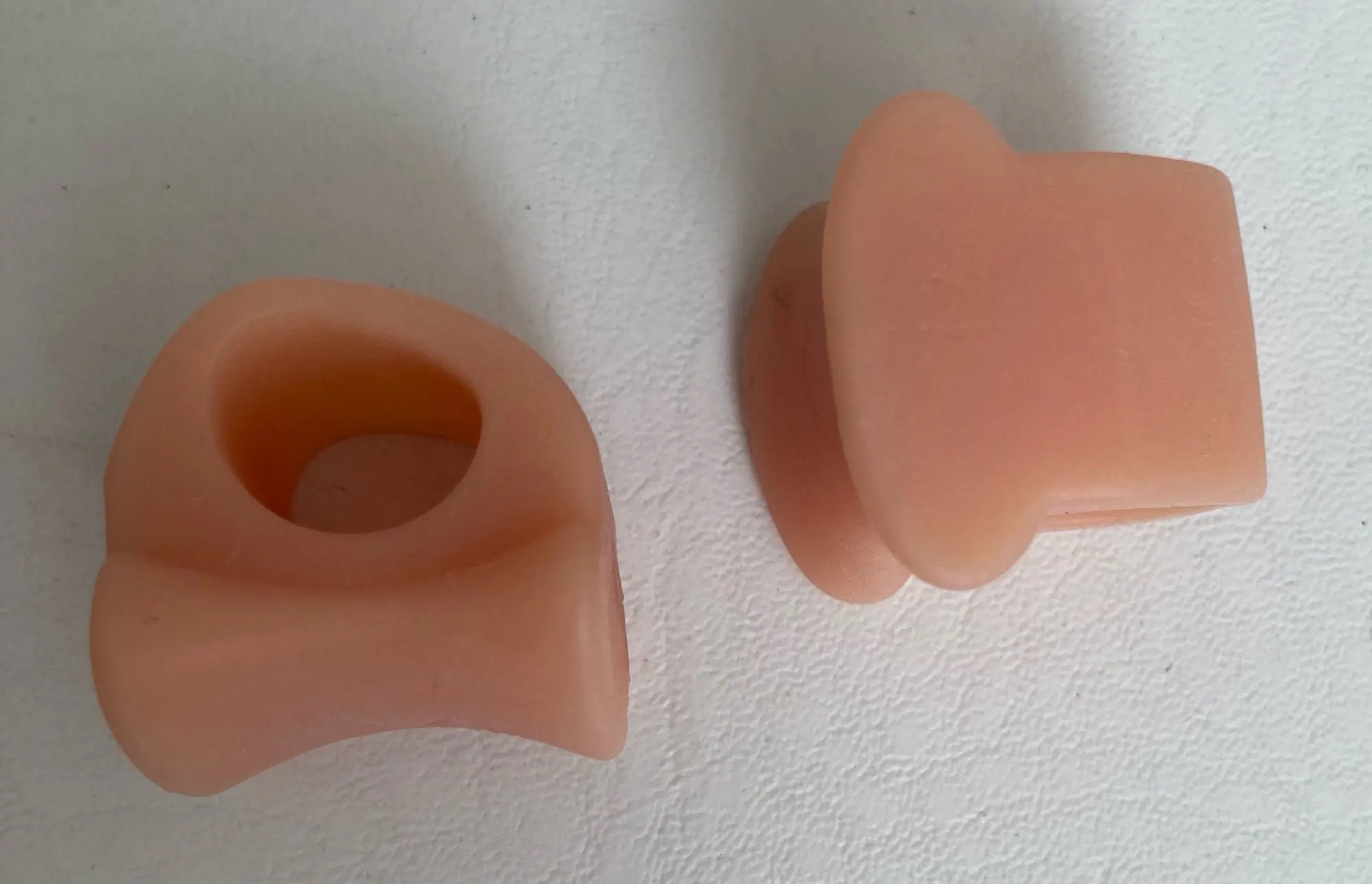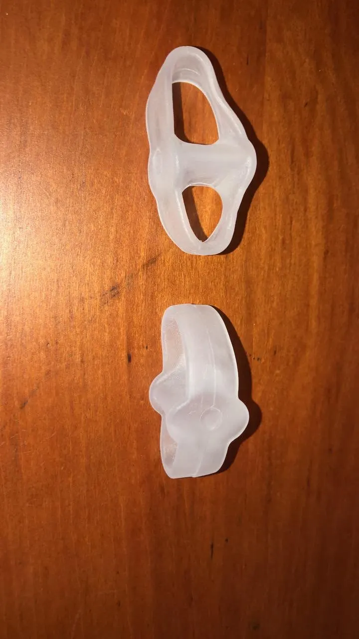 Пользуюсь вкладышами давно. Раньше покупал на 2 пальца. В них разделитель маленький. У этих он больше. Надеваю на средний палец. В результате большой не цепляется за обувь. Материал очень мягкий.