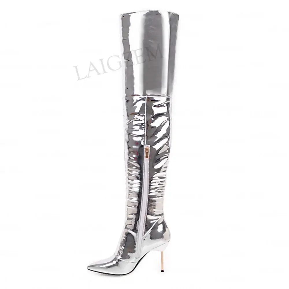 LAIGZEM/женские облегающие высокие сапоги; Лакированные Серебристые Сапоги выше колена на металлическом каблуке с боковой молнией; Клубная обувь для вечеринок; Женская обувь; Размеры 33, 42, 43