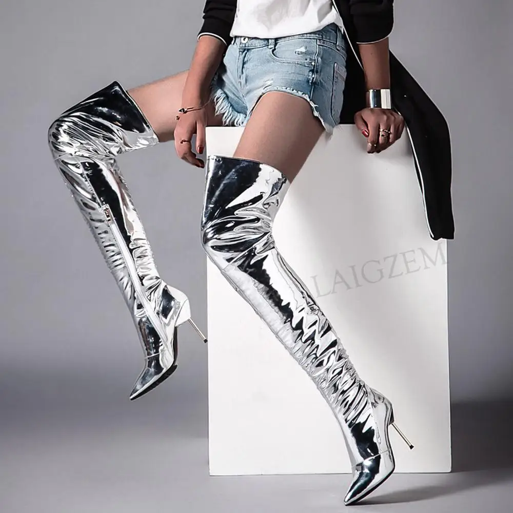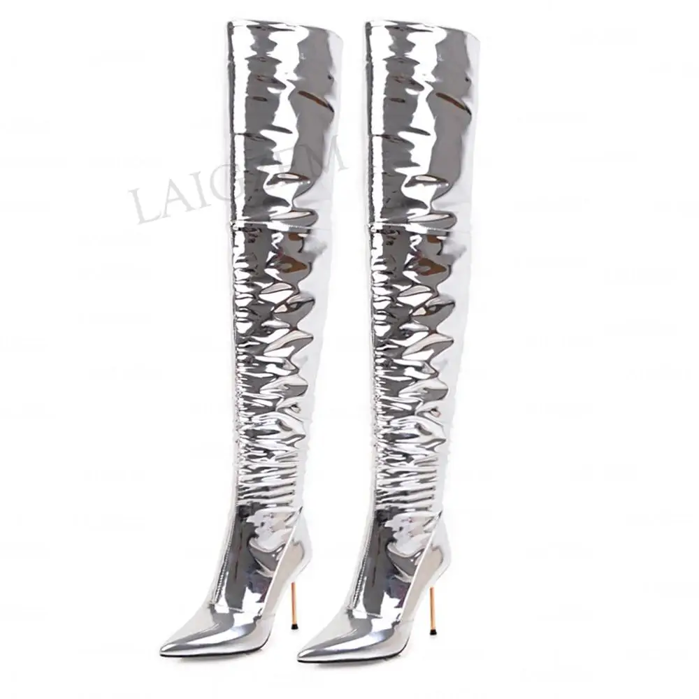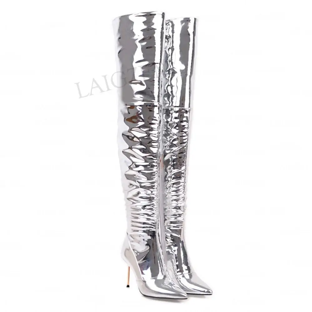 Женские высокие сапоги laigзем до бедра, лакированные серебристые металлические сапоги на каблуке с боковой молнией, плиссированные Сапоги выше колена, вечерняя Клубная обувь для женщин, Размеры 33 42 43