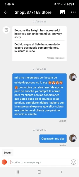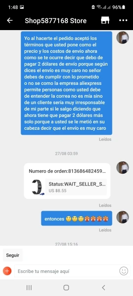 Это мошенник, сначала доставка бесплатна, когда я не отправляю заказ, я рекомендую его, потому что, и он говорит мне, что я должен заплатить 2 доллара за доставку, потому что По словам самых дорогих, я отправил его позже, он попросил у меня 1 доллар доставки после того, как я попросил его, он якобы отправил мне заказ, но aliexpress указывает, что есть что-то необычное с заказом, и что лучше начать спор для вернуть деньги, они должны выбросить этого мошенника из приложения
