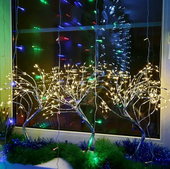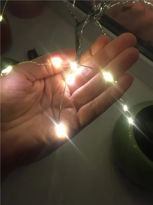 Он был в толстой пуговице живота, но коробка была смята. Это не влияет на лампу. Все светодиоды могут работать, касаться кнопки, provolka хорошо сгибается и сохраняет свою форму. Сам чемодан выглядит очень просто, завернутый в серебряную фольгу. Это дерево создает комфортную и праздничную атмосферу. В целом, мне нравится. Питание от адаптера и аккумулятора, сенсорная кнопка