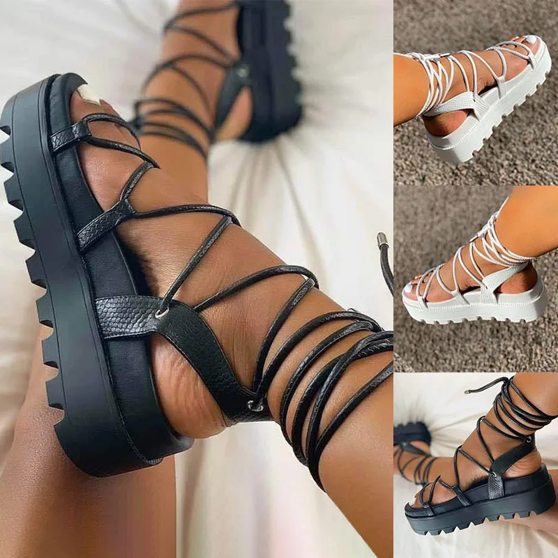 Женские модные однотонные сандалии на платформе со шнуровкой римская обувь Размер: 36-43 Цвет: черный, белый Материал: материал подошвы: композитный материал; Внутренний материал: искусственная кожа повод: подходит для прогулок, путешествий, покупки, дома и так далее. Посылка включает в себя: пара обуви, Ширина обуви нормальная