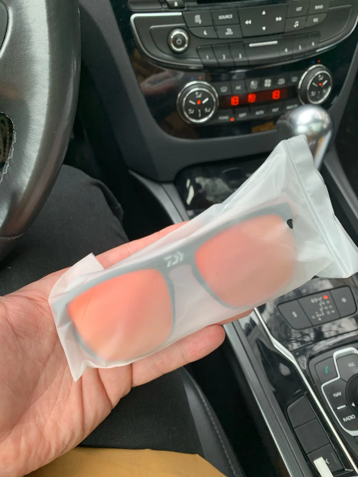 Упаковано хорошо, очки идут без чехла. Пластик хороший, даже какая-то поляризация видна. На рыбалку пойдут.