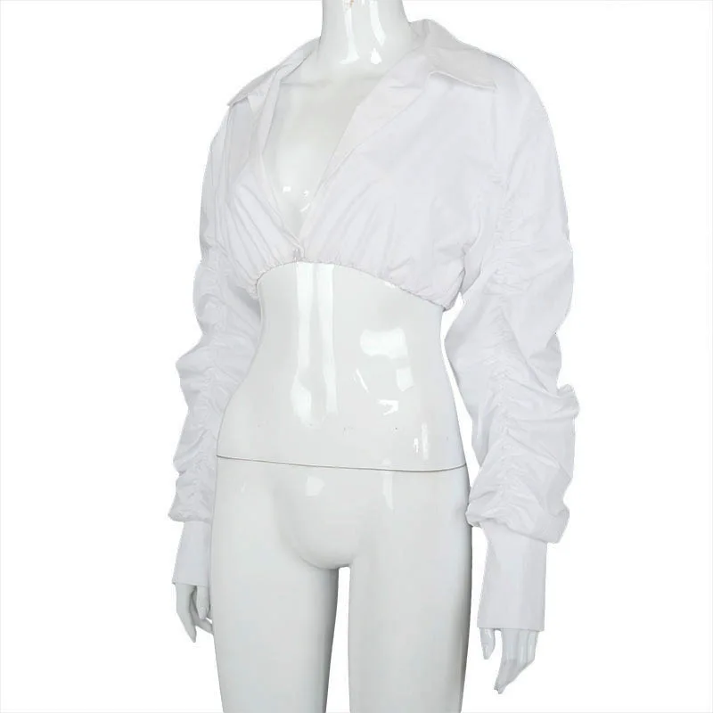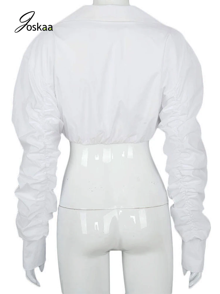Joskaa с пышными рукавами, белая блузка, рубашки для женщин Осень Глубокий v-образный вырез с рюшами плиссированное платье с длинным рукавом; Комбинезон с отворотами и кроп Топ женские пикантные офисные туфли-тройник