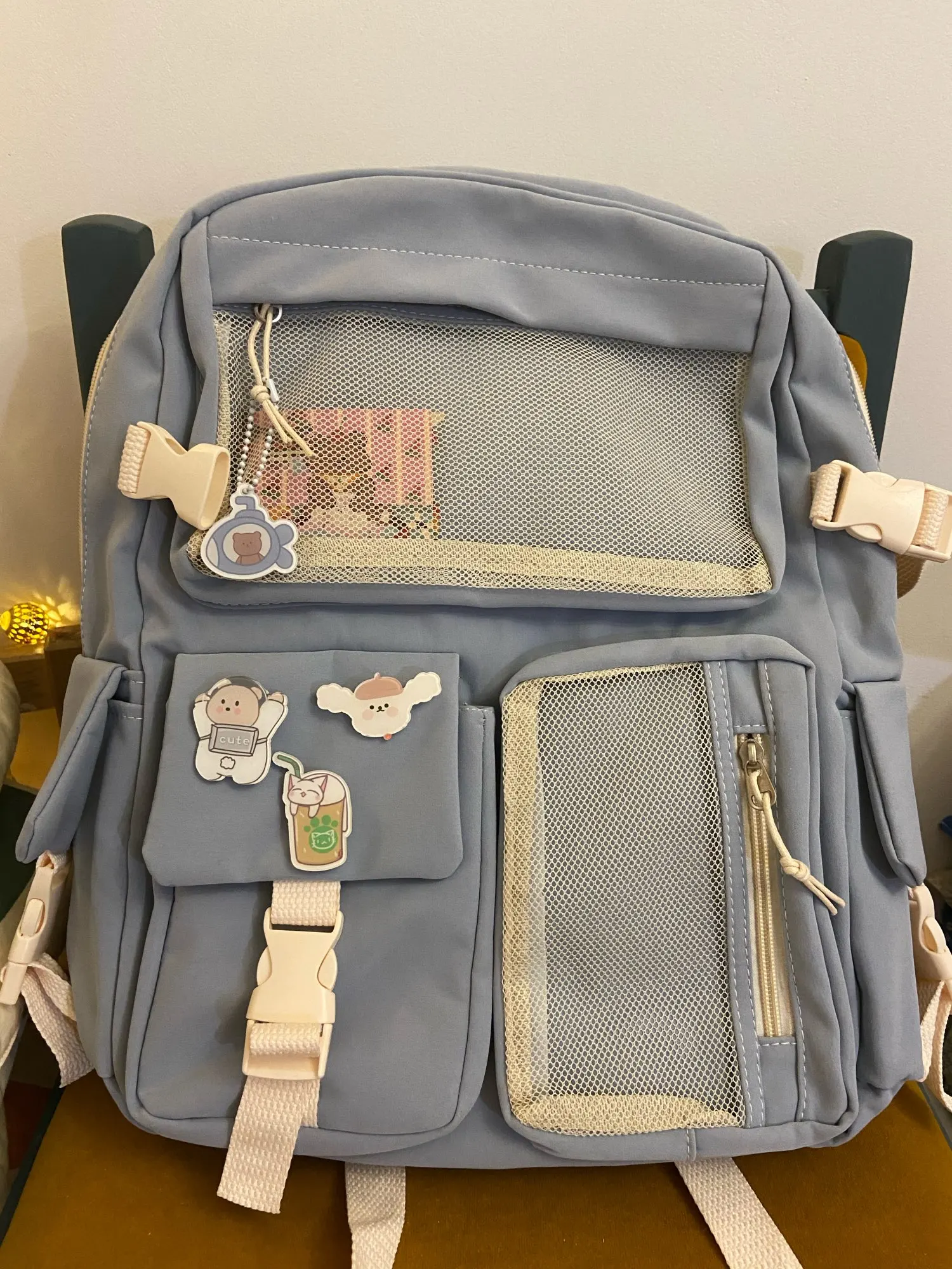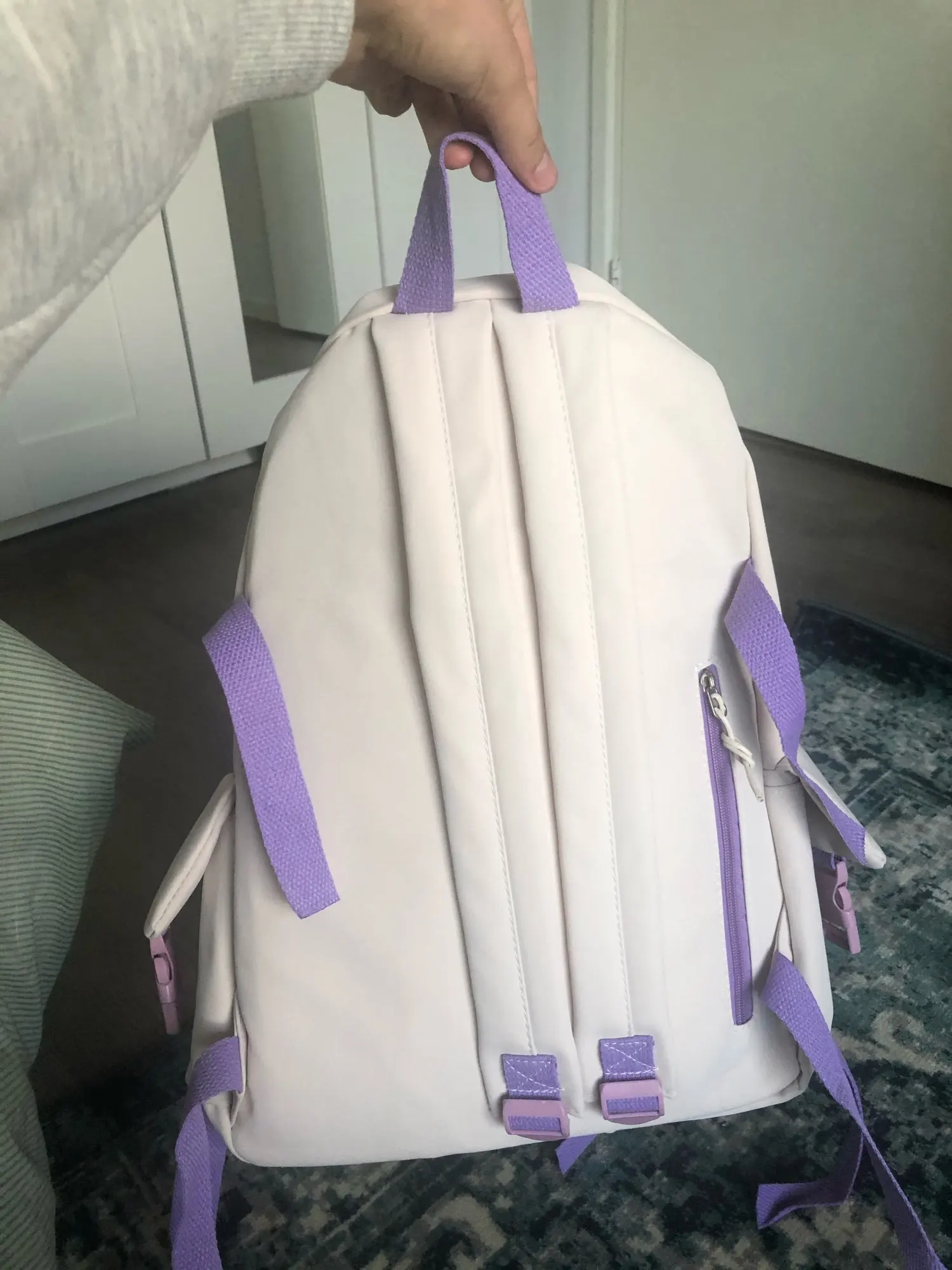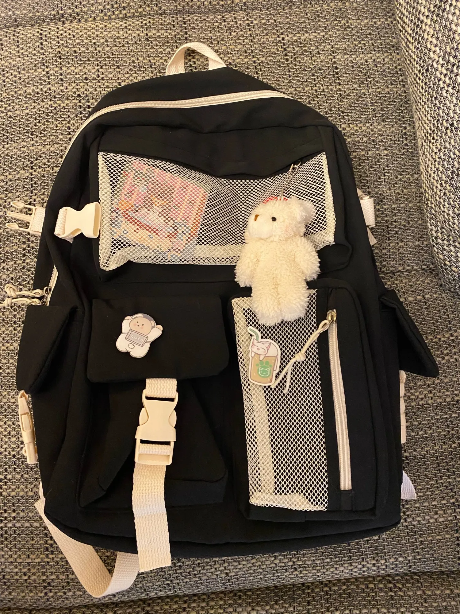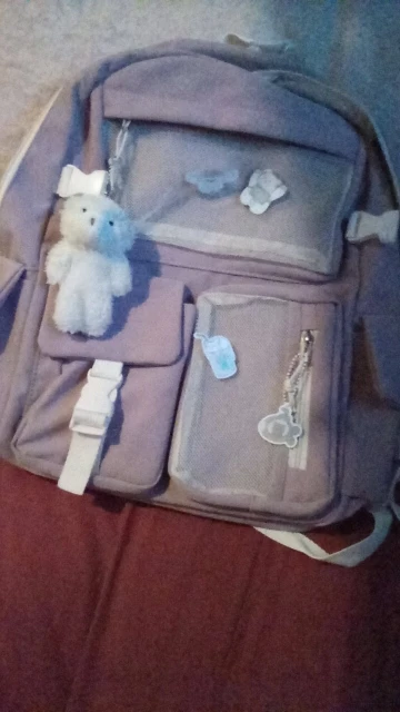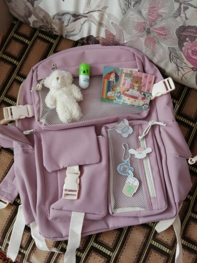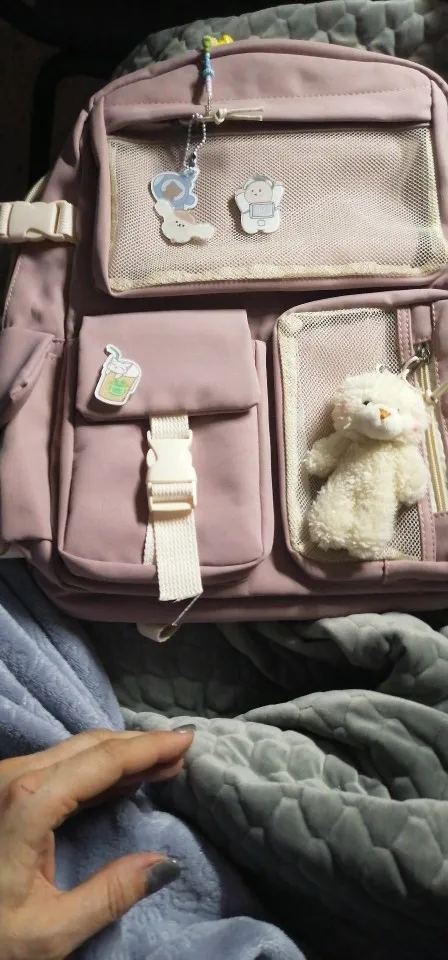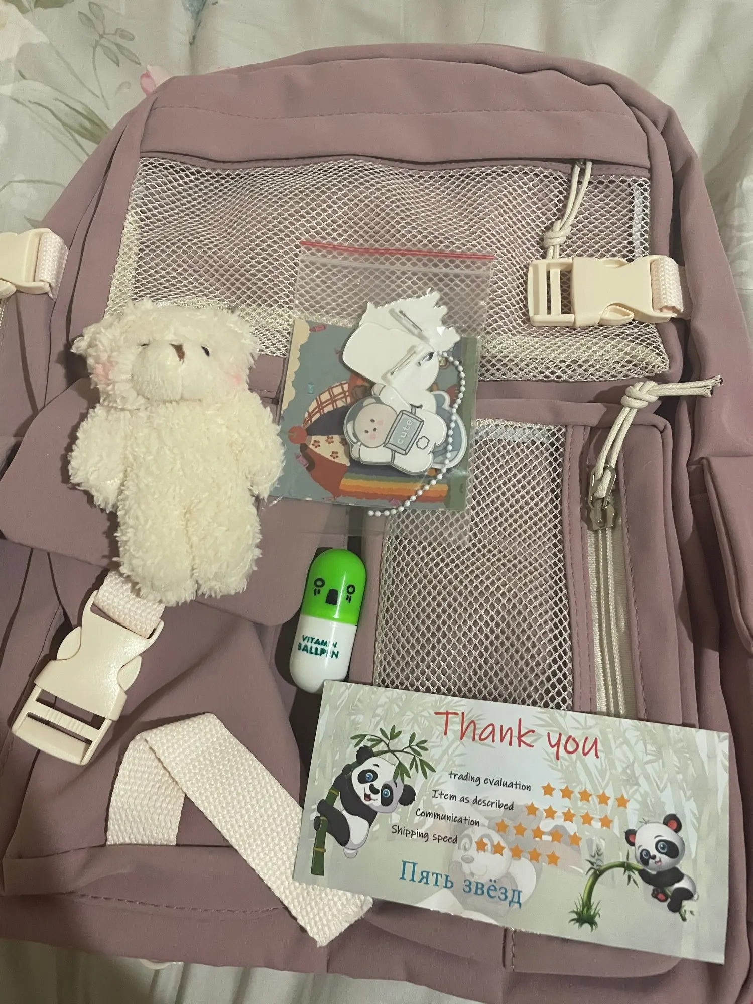 Сумка очень просторная, хорошего качества и очень милая. Он пришел очень быстро (я заказал 30 ноября) и пришел с 3 милыми значками, пластиковым брелком, плюшевым брелком, браслетом желаний и одной из этих маленьких ручек для таблеток. В целом я очень доволен и доволен своим продуктом, и в моей сумке много места, чтобы соответствовать моим школьным вещам.