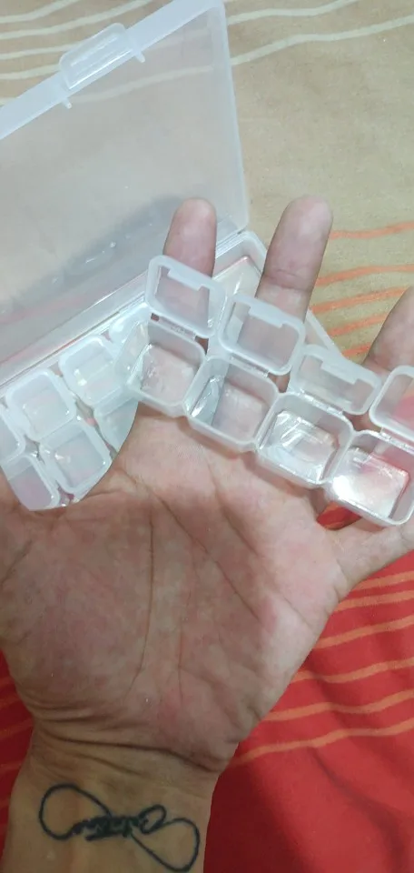 Très bon produit, je pensais seulement que la boîte avais de plus grandes cases (les petites boîtes à l'intérieur), l'inconvénient de cet article est que les boîtes de rangements sont rattachées par rangées de quatre. J'y ai rangé paillettes, strass, diamants,... pour le nail art.