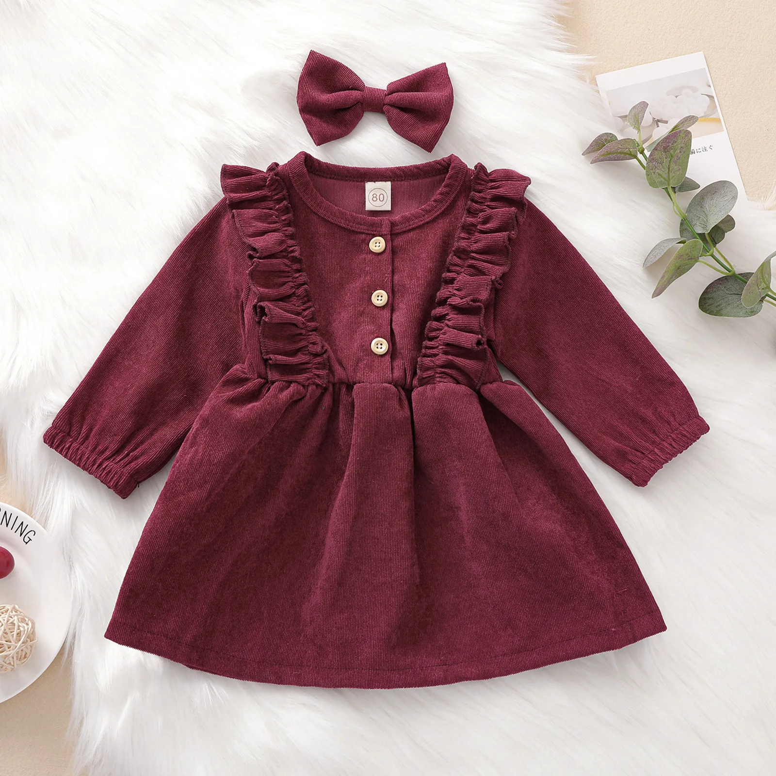 От 0 до 6 лет, осенняя футболка для новорожденных Детская осенняя Платье для маленьких девочек повязка на голову 2 шт. с однотонными оборками, длинными рукавами и рисунком бантика, Кнопка A-Line платье 4 цвета
