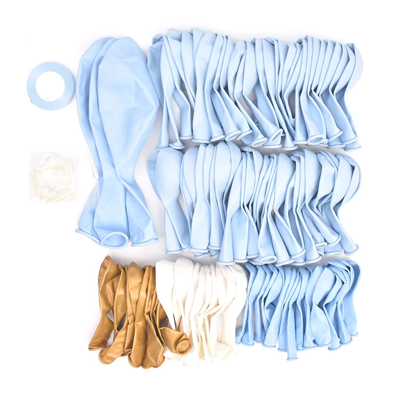 В комплект входит: 103 шт. 5-дюймовый синий шар 20 шт. 10-дюймовый синий шар 60 шт. 10-дюймовый белый шар 10 шт. 10-дюймовый Хром золотой шар 10 шт. 18-дюймовый синий шар 3 шт.
