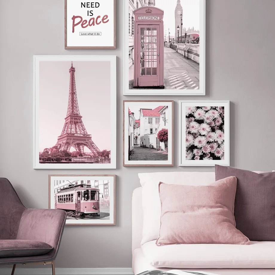 Скандинавский принт постеры, розовый городской автобус, цветок, стр...