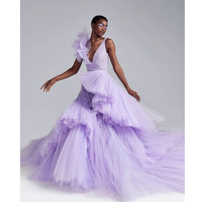 Женское вечернее платье, длинное Пышное с оборками из тюля лавандового цвета с завязкой сзади, размера плюс для выпускного вечера