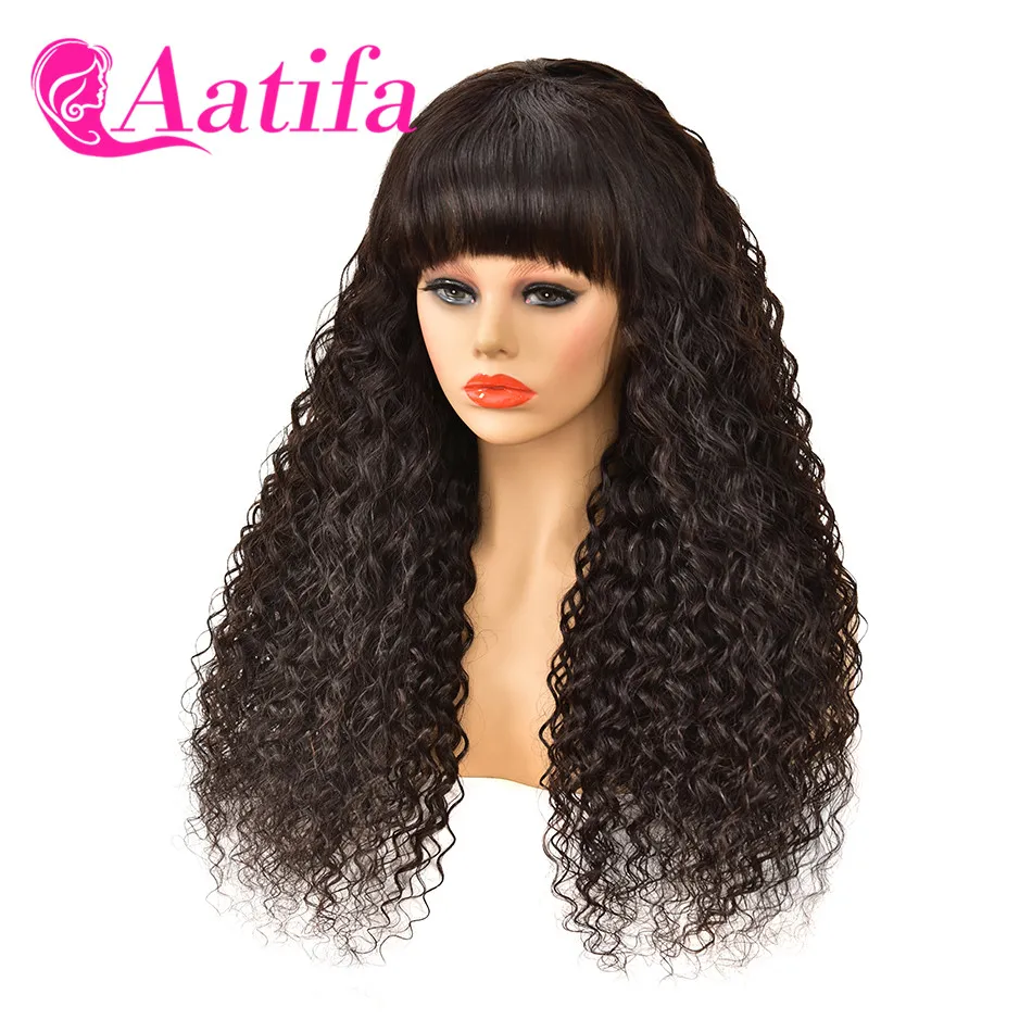 Лента для волос: AATIFA Hair Материал волос: 100% натуральные человеческие волосы Remy Плотность: 150% 180% плотность Линия волос: предварительно выщипанная естественная линия волос Тип волос: полные машинные парики с челкой Волна Волос: водяная волна Длина волос: 8-30 дюймов Цвет волос: натуральный черный цвет Размер шапки: средний размер