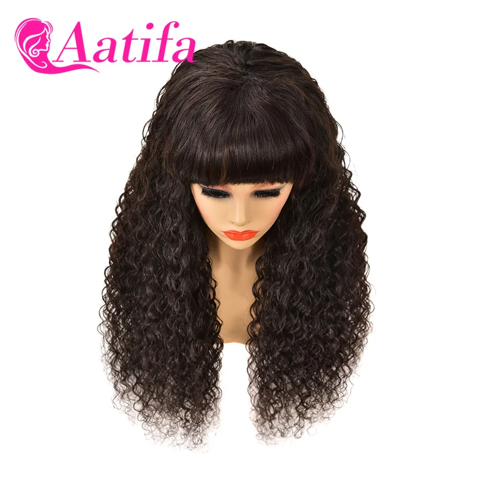 Парики с челкой, полная машина, перуанские волнистые человеческие волосы, естественная волна, 180 плотность, предварительно выщипанные волосы Aatifa Remy, парик