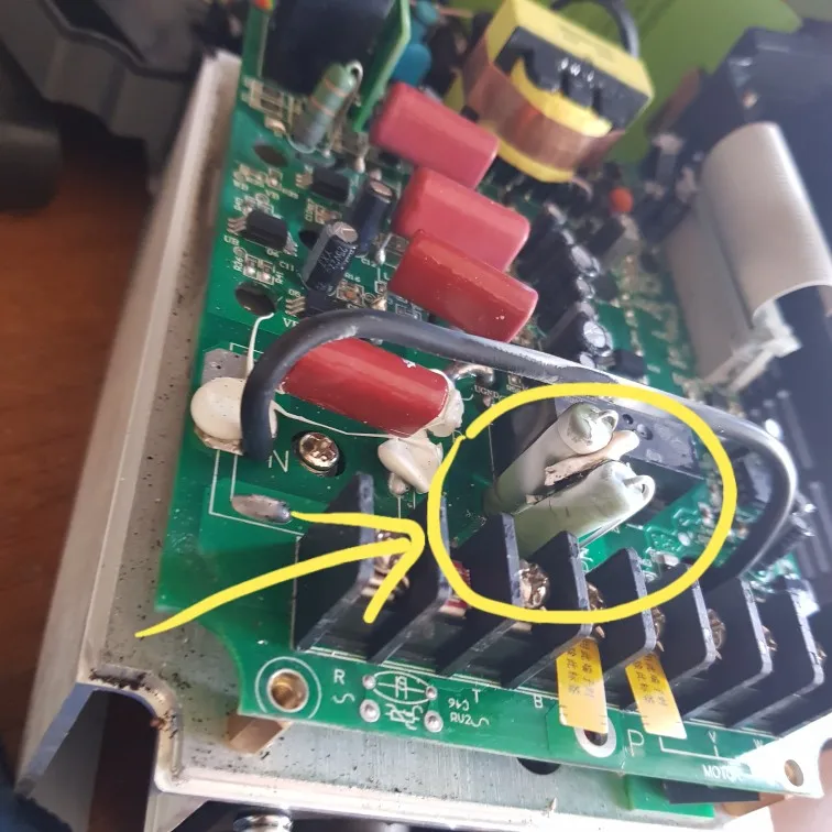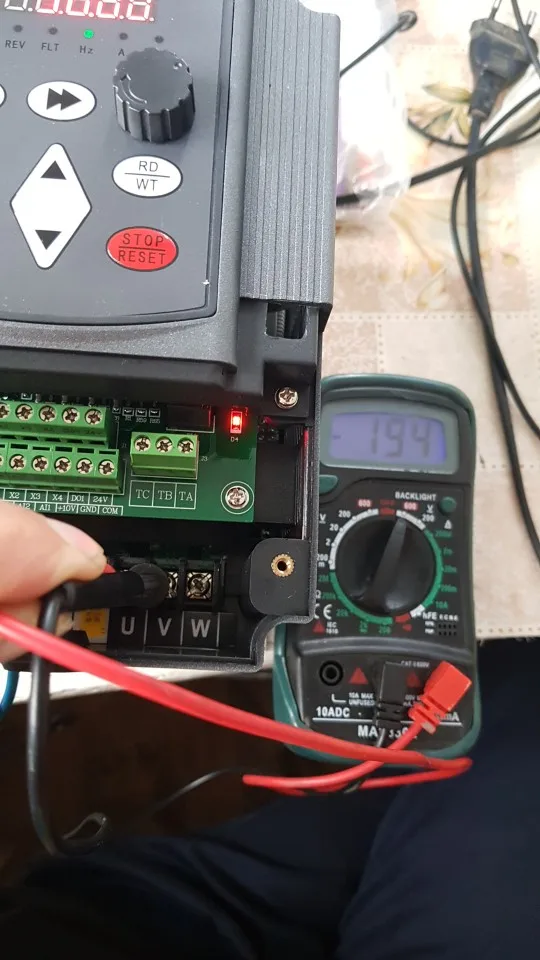 Выдавал всего 260 В между фазами в максимуме без подкючения к двигателю. Подключил двигатель на 2.2 кВт и частотник не смог его запустить. А через пару попыток и вовсе задымился. Двигатель, к сведению, спокойно работает от другого частотника на 2.2 кВт от другого продавца, так что к нему вопросов нет.