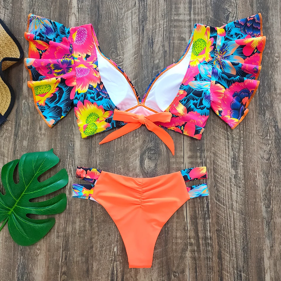 Купальник-бикини женский, с цветочным принтом и оборками, с высокой талией