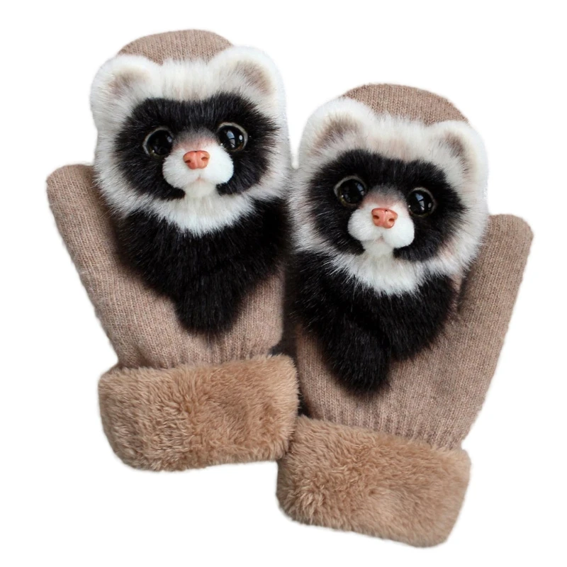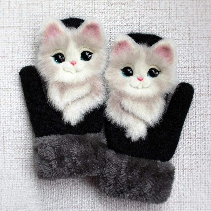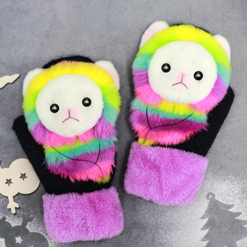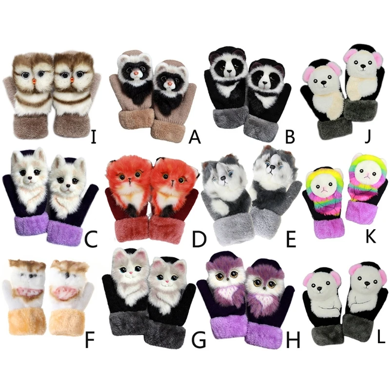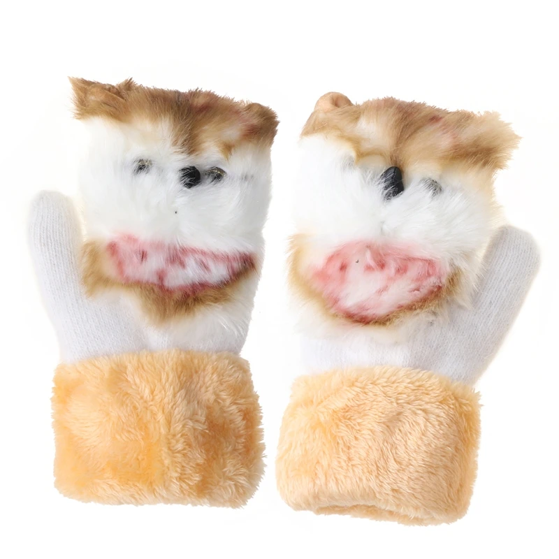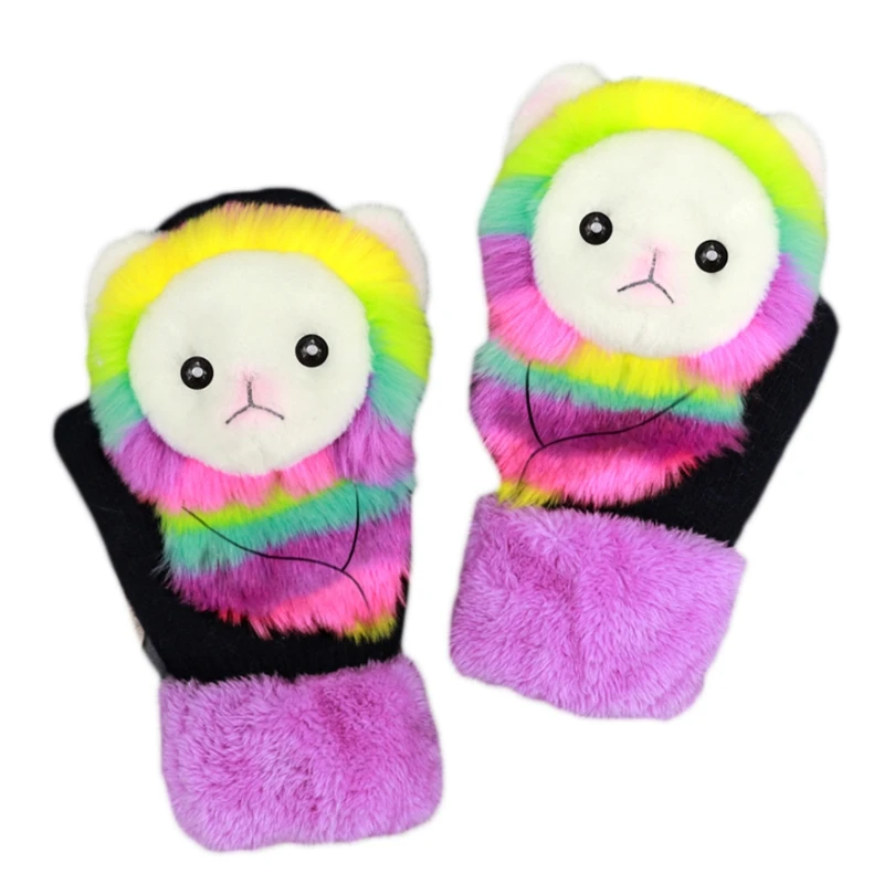 Женские и мужские зимние вязаные перчатки, милые 3D пушистые термоварежки с мультяшными животными