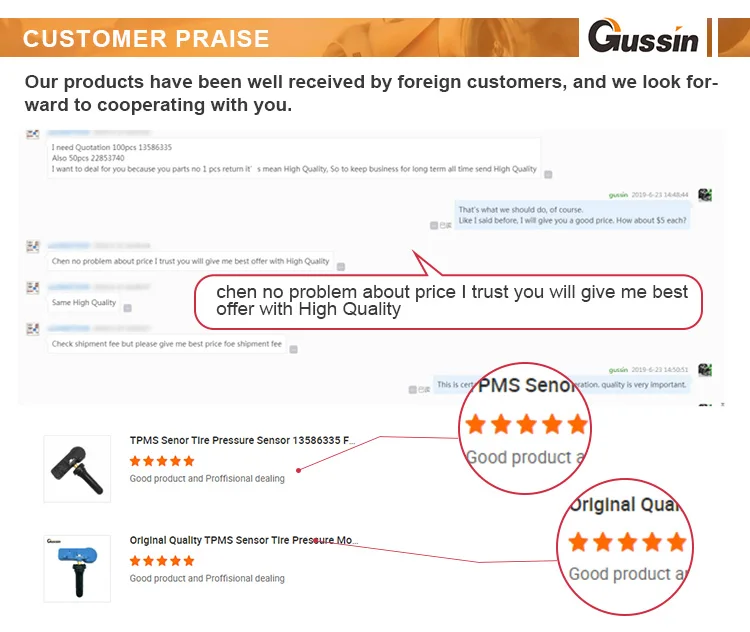 В: Как вернуть товар, если возникли какие-либо проблемы?О: покупателю не нужно оплачивать стоимость доставки для возврата. Можете связаться с нашим продавцом для работы.В: Каковы преимущества датчика давления в шинах Jusheng?О: Jusheng владеет собственной фабрикой, имеет независимые исследования и разработки и независимую производственную мощность. Продукты используют аккумуляторы Maxcell и чипы Freescale, чтобы вернуть покупателям высококачественные и стабильные продукты.В: можем ли мы заказать много различных автозапчастей и сделать комбинированную доставку?О: мы можем объединить много товаров, и доставить курьером/sealland/air и т. Д. Пакет хорошо.В: Как я могу сделать наш собственный бренд для моего заказа?О: если количество заказа соответствует требованиям, мы предоставляем индивидуальное обслуживаниеВ: какая доставка, если я совершу оплату?О: мы отправим товар в наличии в течение 1-3 рабочих дней. Продукты, которые должны быть произведены, будут произведены и отправлены в течение 7-15 рабочих дней.В: можем ли мы посетить ваш завод или офисО: мы всегда приветствуем клиентов посетить нас, дайте мне знать расписание, мы организуем.