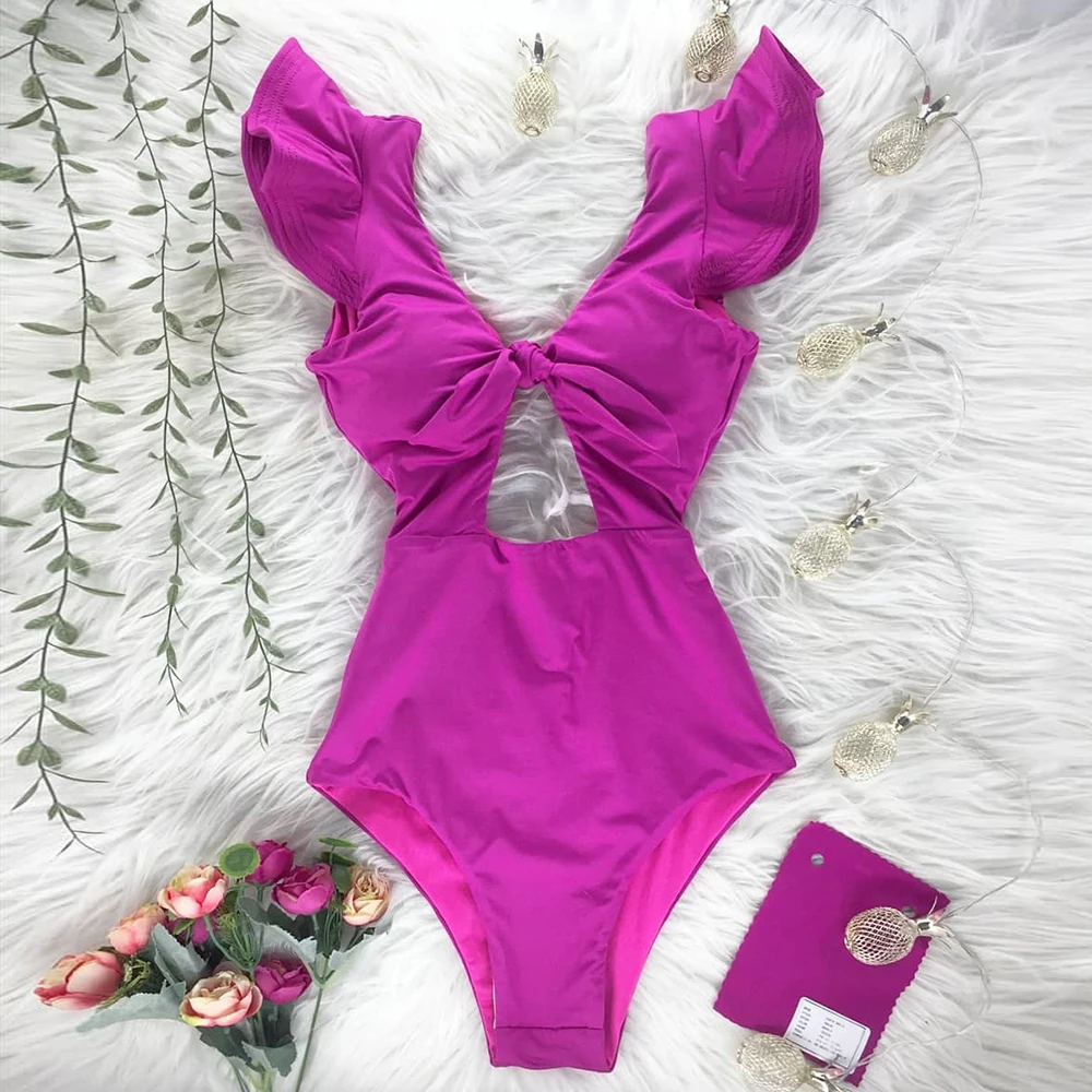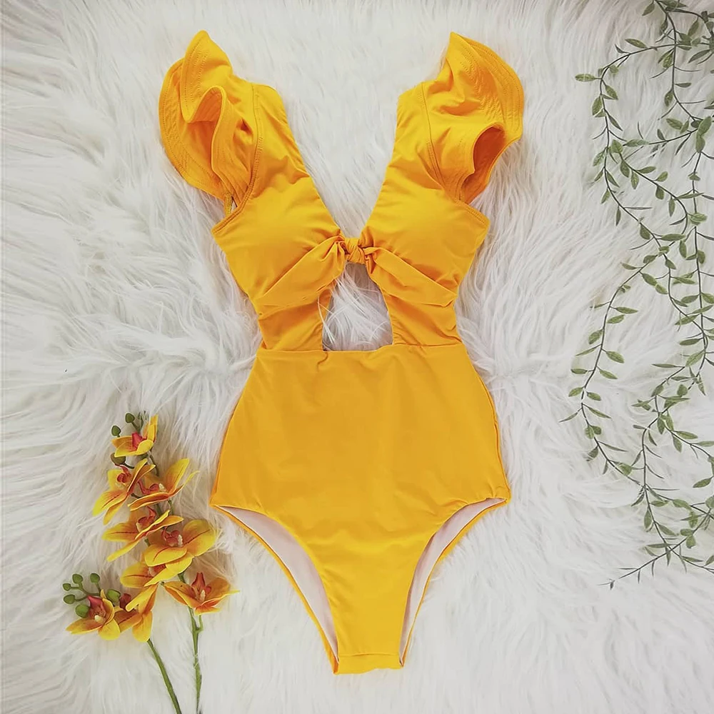 Женский слитный купальник, купальник с открытыми плечами и оборками, однотонный купальник с глубоким V-образным вырезом, пляжная одежда, 2020