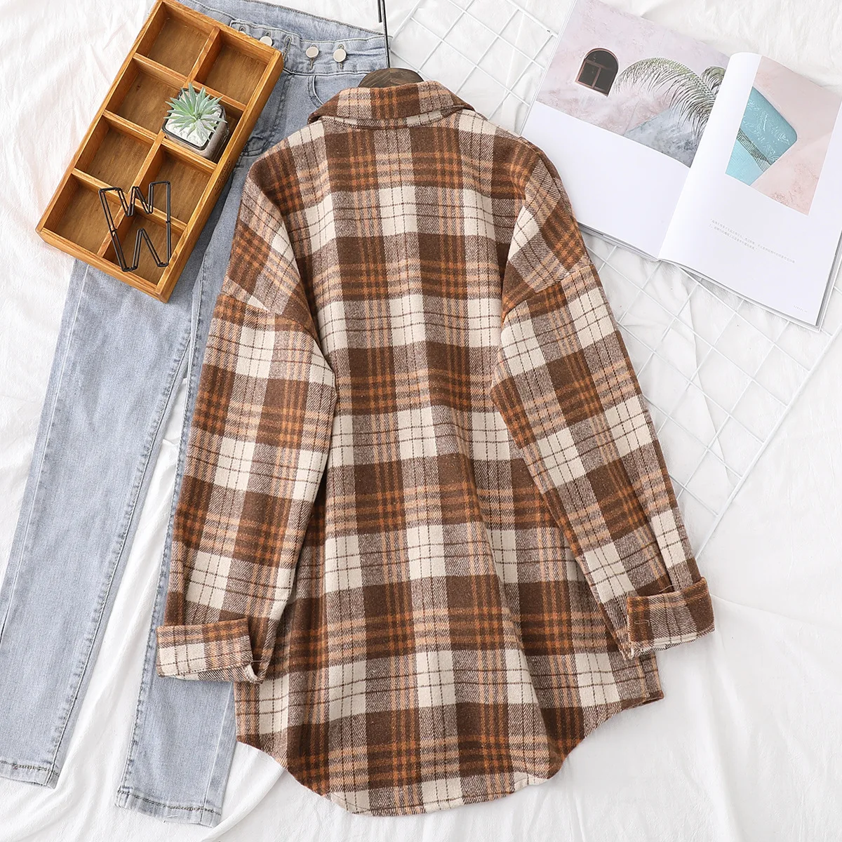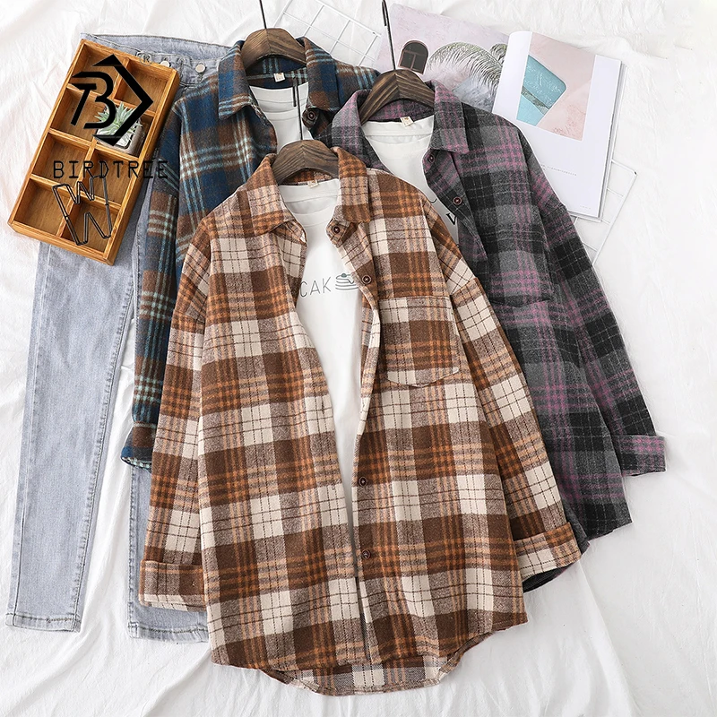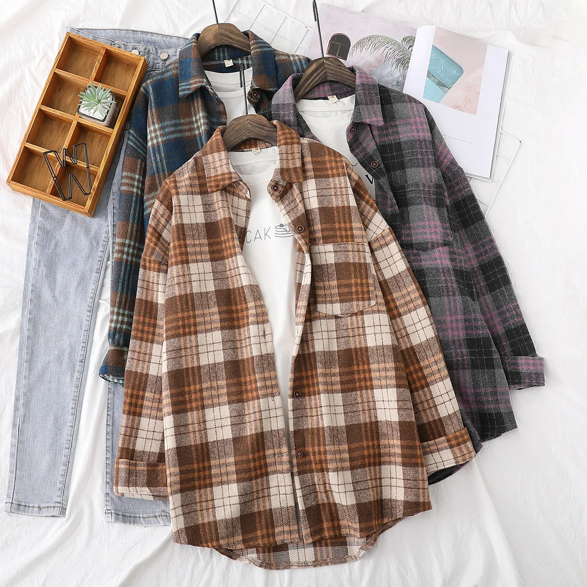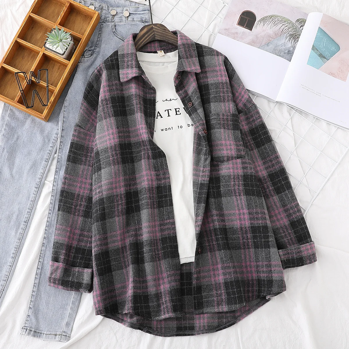 Зимняя новинка, женская фиолетовая клетчатая плотная теплая шерстяная рубашка с длинным рукавом, куртка, винтажные Топы больших размеров, стильная Весенняя верхняя одежда для девочек, T0N436T