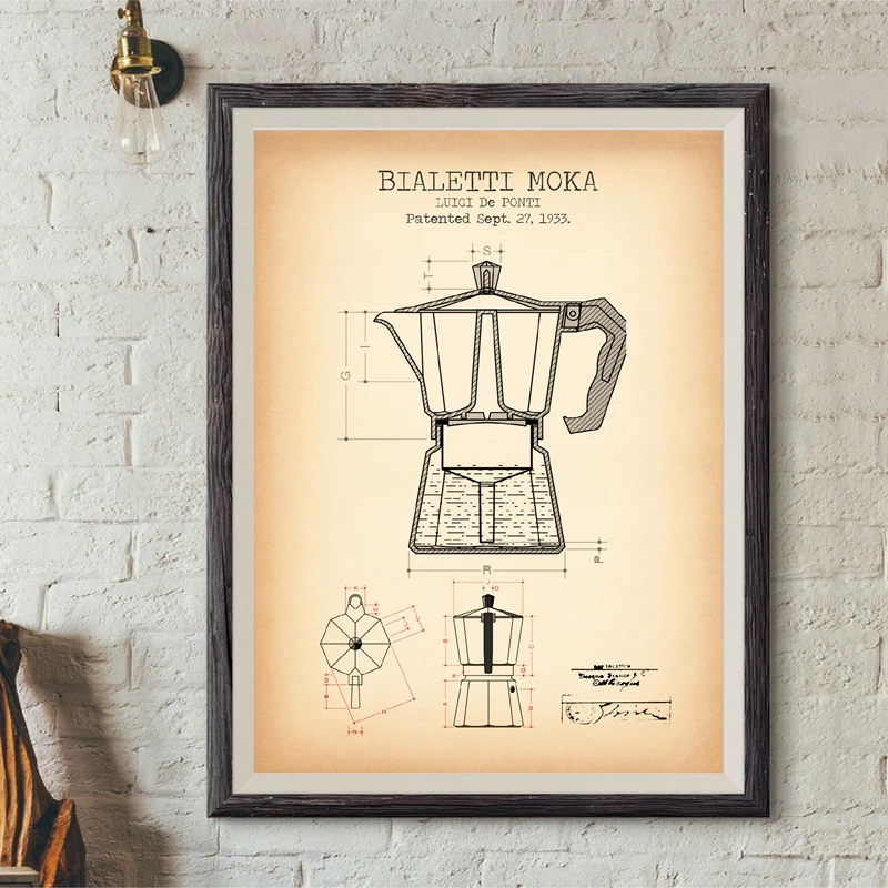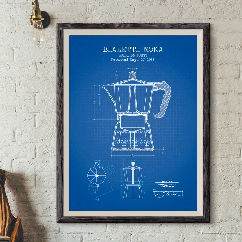 Кофейник, патенты и принты, Bialetti Moka, постер, кофе, чертеж, Картина на холсте, кухонная Настенная картина для домашнего декора