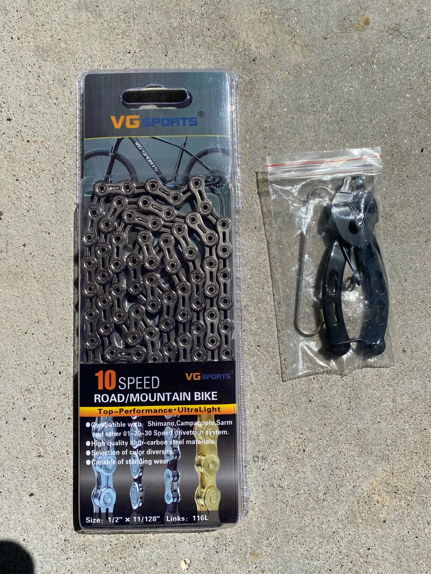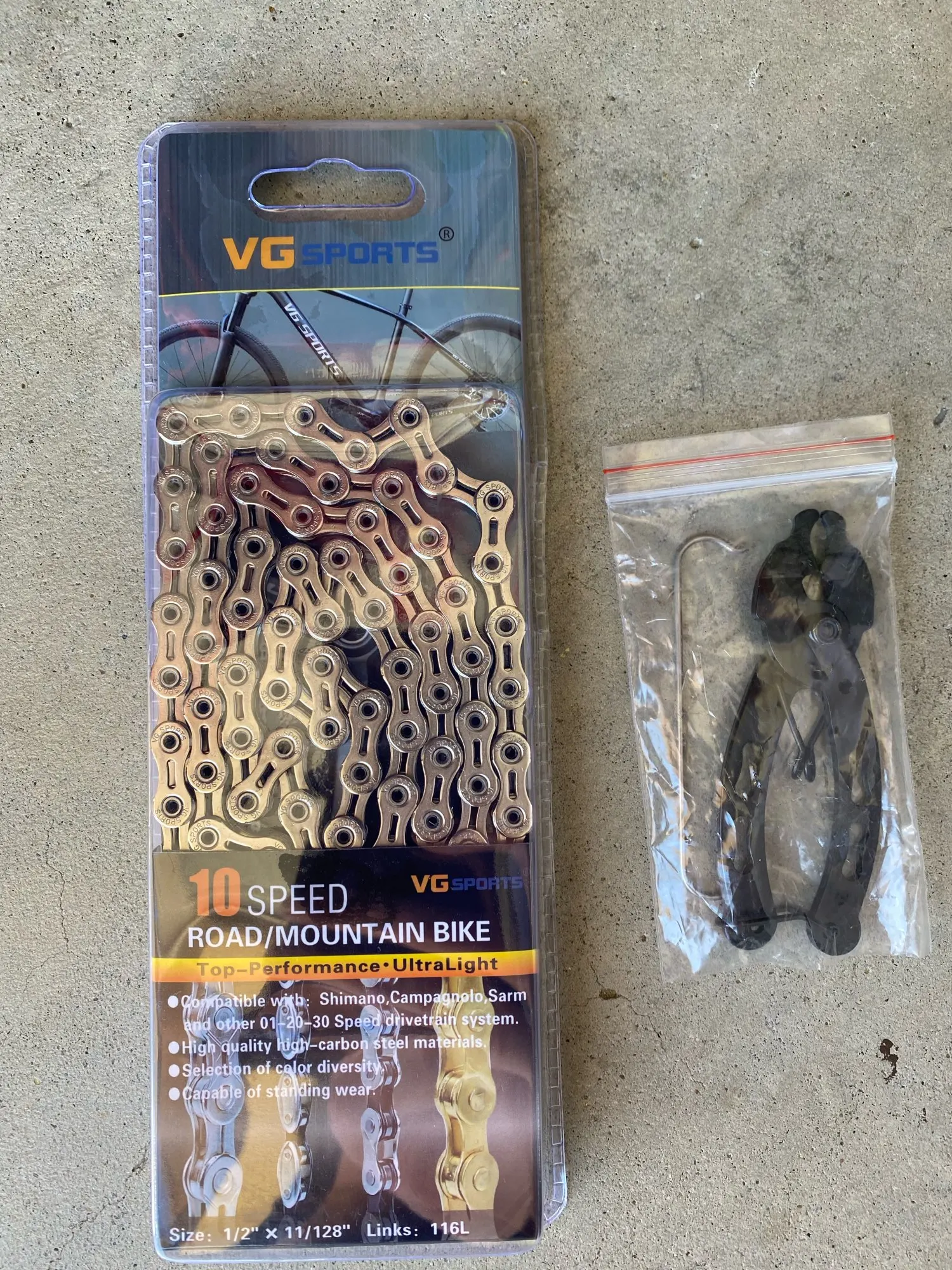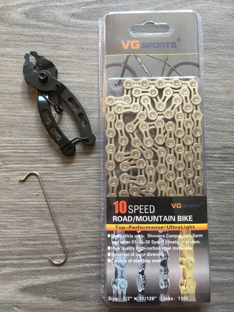 Заказал 10 скоростную полую серебряную цепочку. Продукт хорошего качества. Свет. Использовал цепь, чтобы восстановить мой старый горный велосипед Univega Aplina Pro. Быстрое подключение облегчило установку цепи. Заказал 6 марта 2021 года и получил 26 марта 2021 года. Из Китая в Сан-Diego California. Не взимается налог на импорт или пошлина, которая является хорошей. Мне нравится цепочка и два инструмента, с которыми она поставляется.