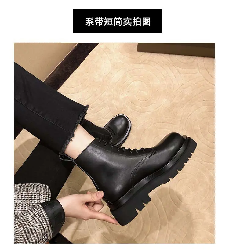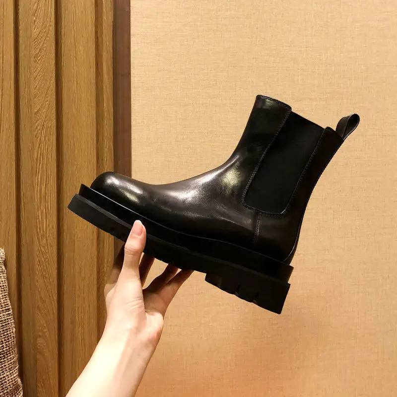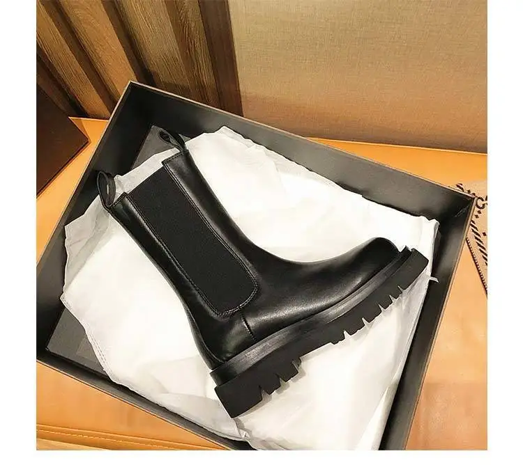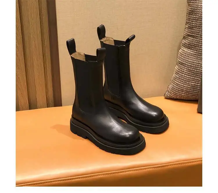 Ботинки до середины икры; Кожаные женские ботинки челси на платформе; Весенние ботинки из воловьей кожи; Модные женские ботинки черного цвета на толстой подошве