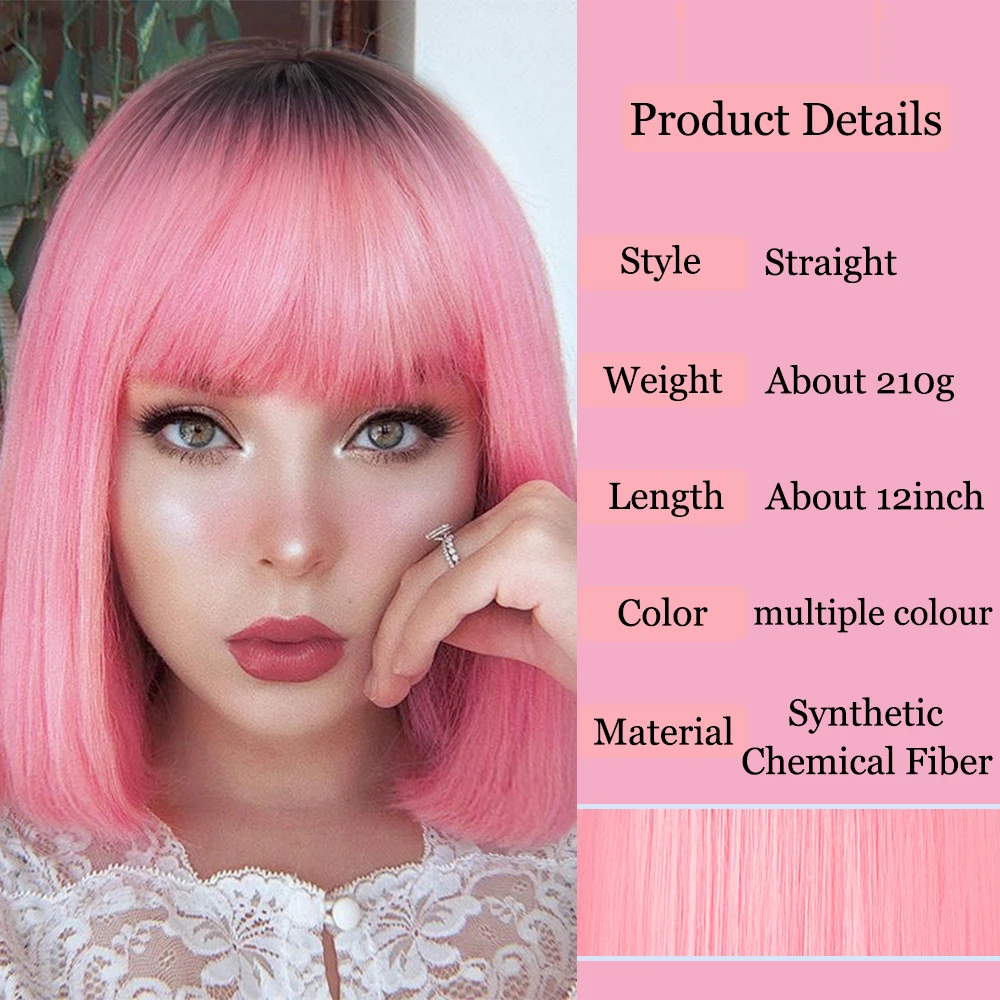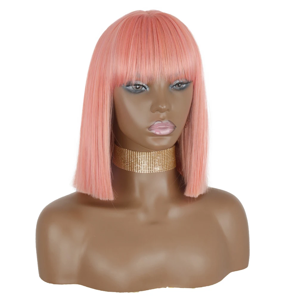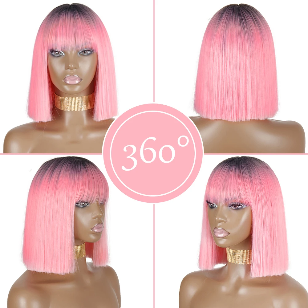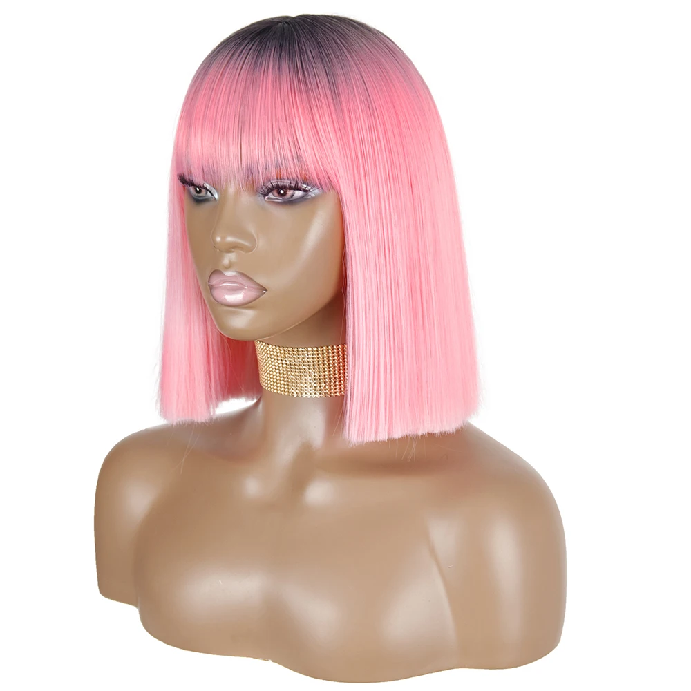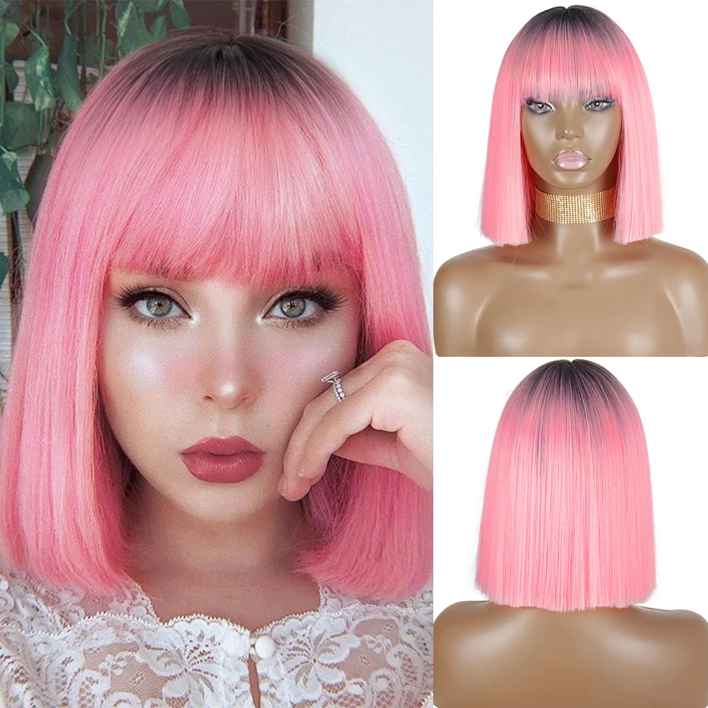 Прямой парик AZQUEEN, короткий, с челкой, женский, синтетический, черный, розовый, для ежедневного использования, длина до плеч