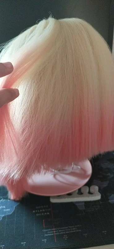 Парик очень мягкий. Челка немного длинная, но может быть обрезана. Полная длина, хорошая. Цвет блестящий. Я бы сказал, что это хороший парик, потому что это не дорогой парик.