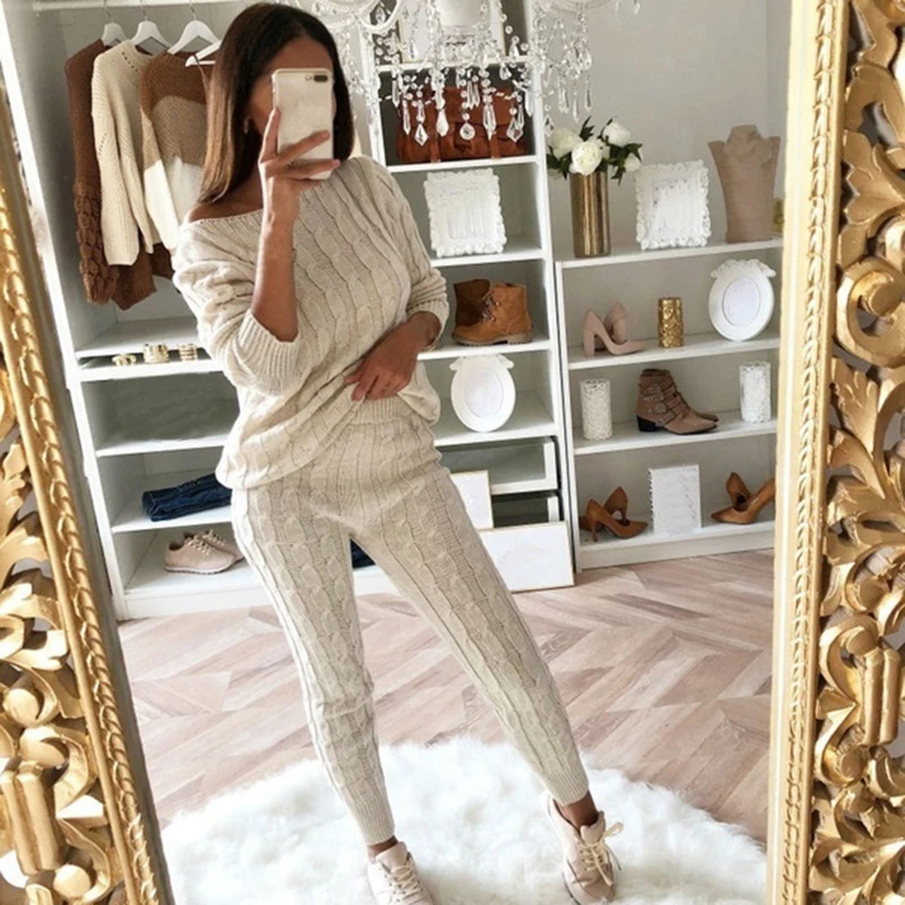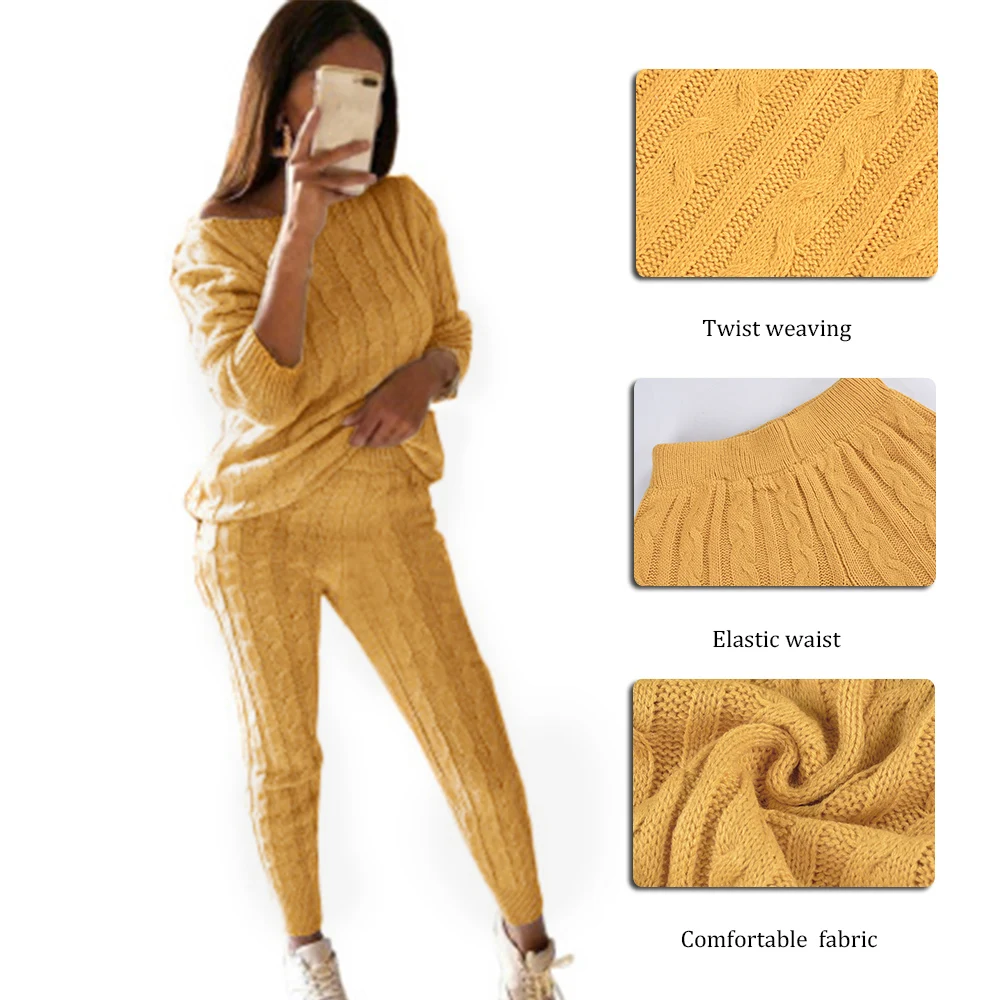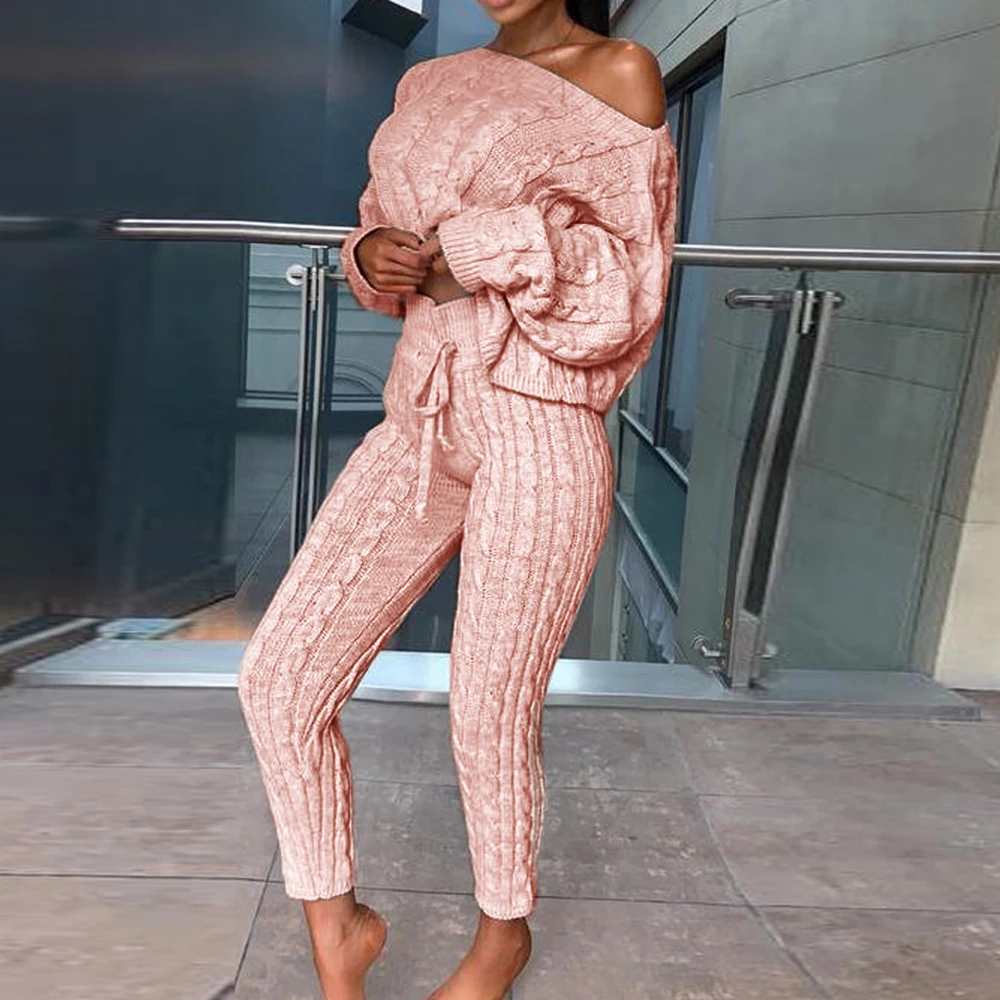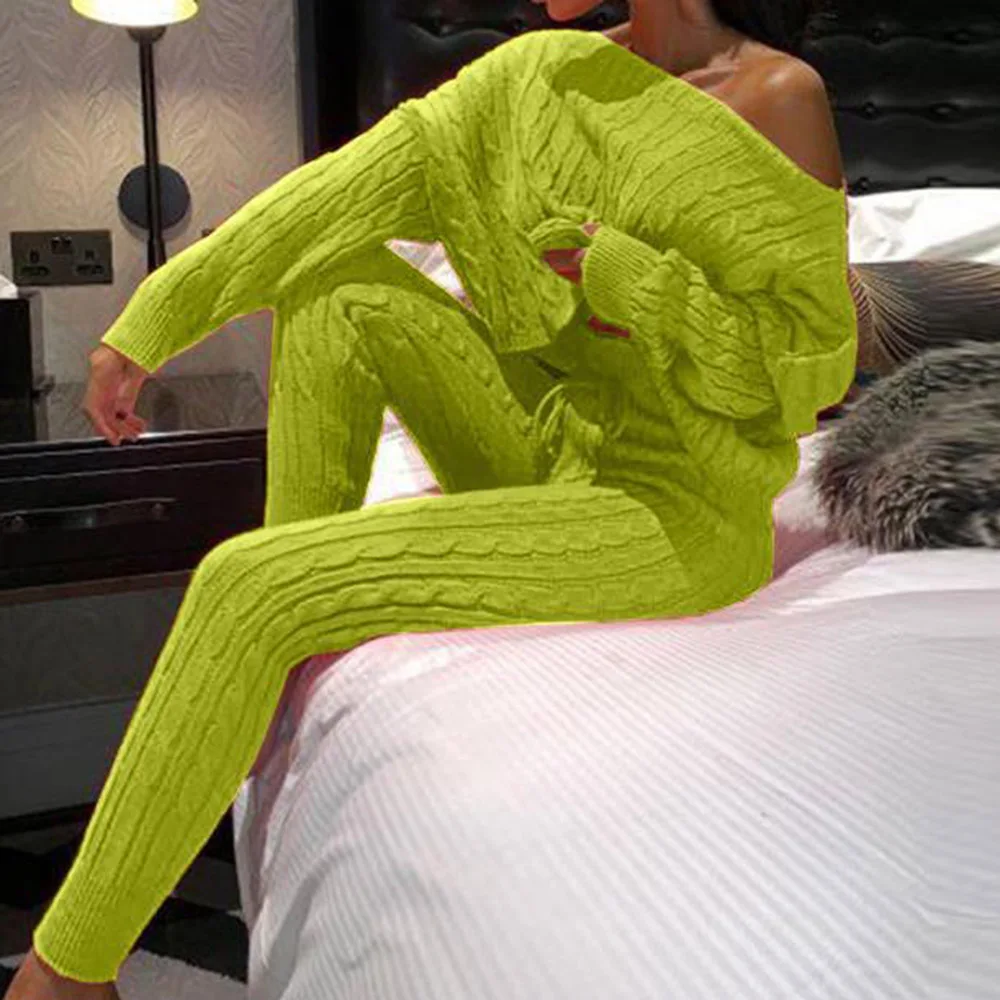 Комплект из 2 предметов, зимний Однотонный свитер с открытыми плечами и штаны для женщин, трикотажная пижама