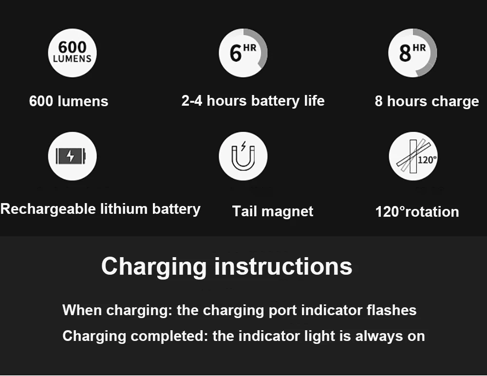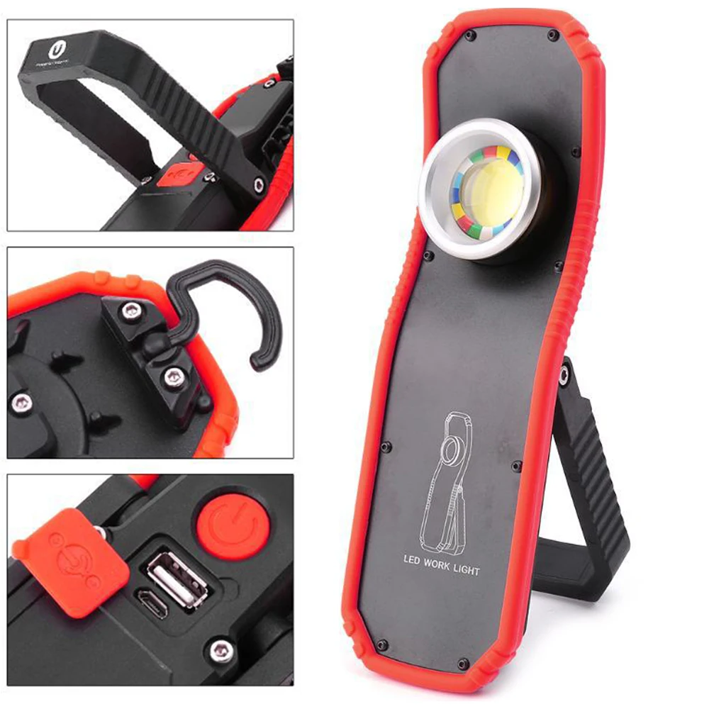 Есть мощный магнит внизу, вы можете наклеить его на любую железную поверхность. Компактная конструкция, легкий вес, дизайн пластиковых крючков, легко носить с собой. С прочной регулируемой ручкой, вы можете легко поддерживать его и разместить его там, где вам нравится. Дизайн usb-входа и выхода удобен для зарядки рабочего светильник в любое время. Может использоваться в качестве резервного банка питания для вашего мобильного телефона или других мобильных устройств в чрезвычайной ситуации. Применение: открытый, кемпинг, приключения, ночная рыбалка, техническое обслуживание автомобиля.