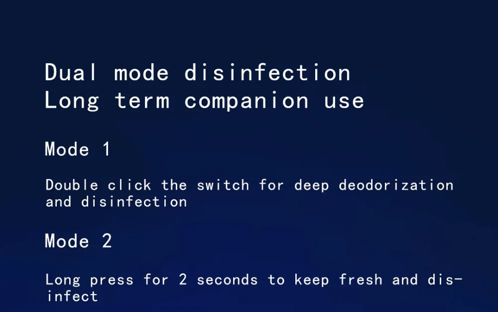 Дважды нажмите кнопку, чтобы включить режим глубокого дезодорирования, красный свет будет гореть в течение 30 минут, затем гаснет, и спите в течение 30 минут. Работайте в течение 30 минут и спите в течение 30 минут, пока батарея не разрядится.