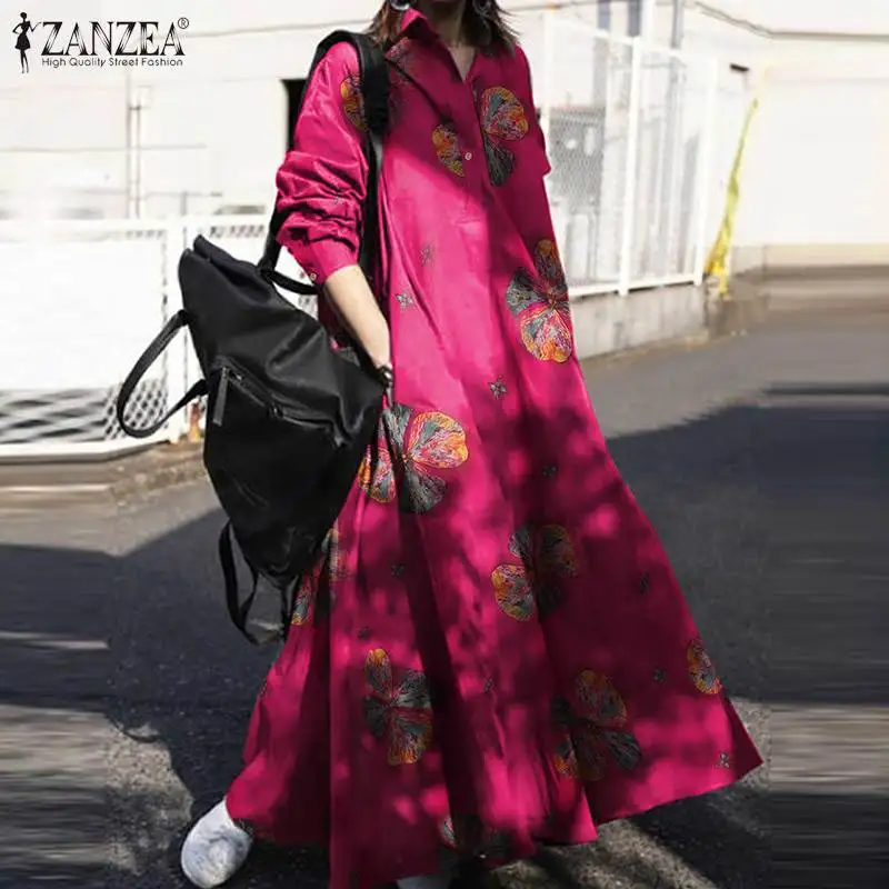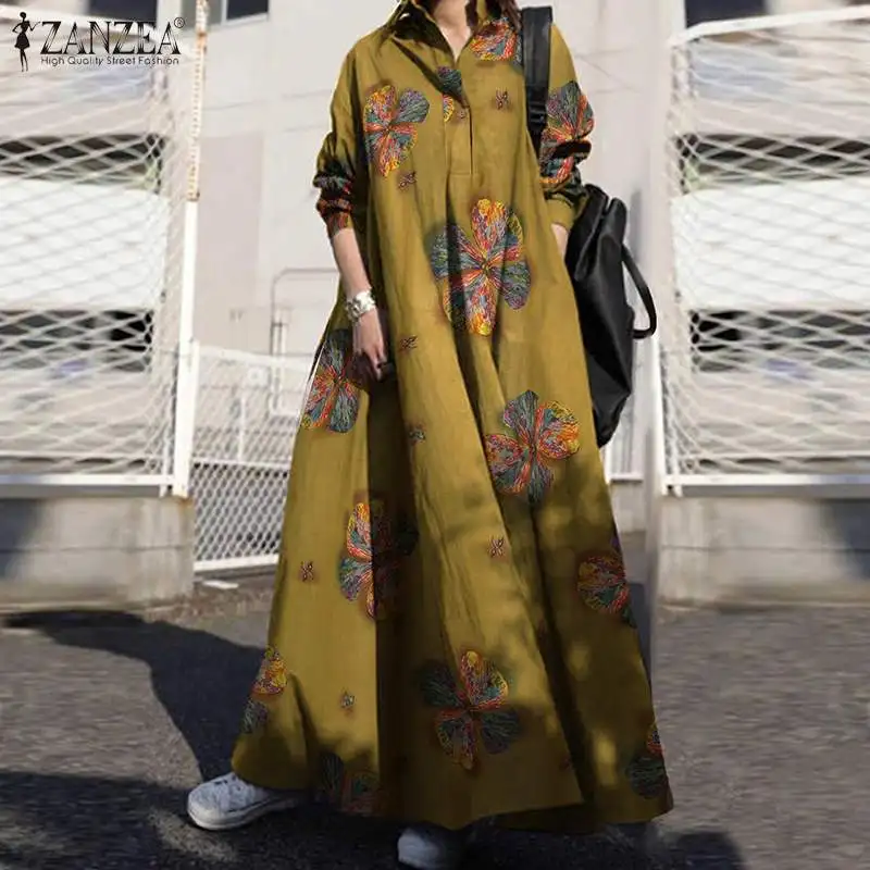 Женское винтажное длинное платье ZANZEA, Осеннее Повседневное платье в стиле ретро с отложным воротником и длинным рукавом, свободные платья, кафтан, сарафан с цветочным принтом