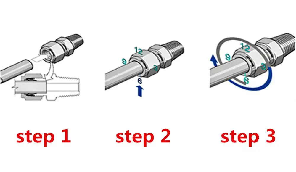 Шаг 1: вставьте трубу в соединение, убедитесь, что отверстие трубы достигает дна соединения, и затяните гайку вручную