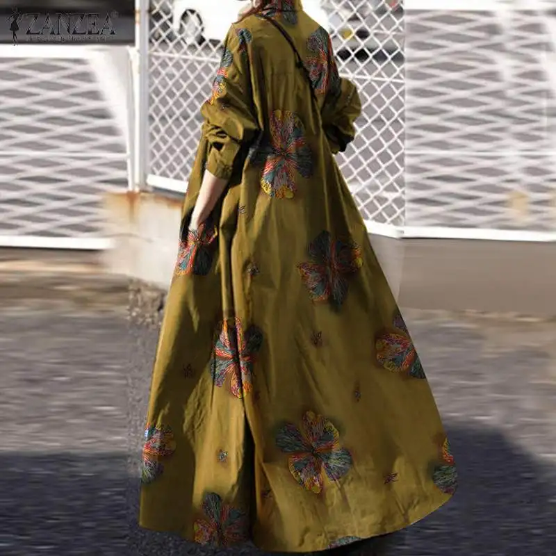Платье ZANZEA женское винтажное длинное с цветочным принтом, повседневный Длинный Сарафан свободного кроя в стиле ретро, с воротником с лацканами и длинным рукавом, осень