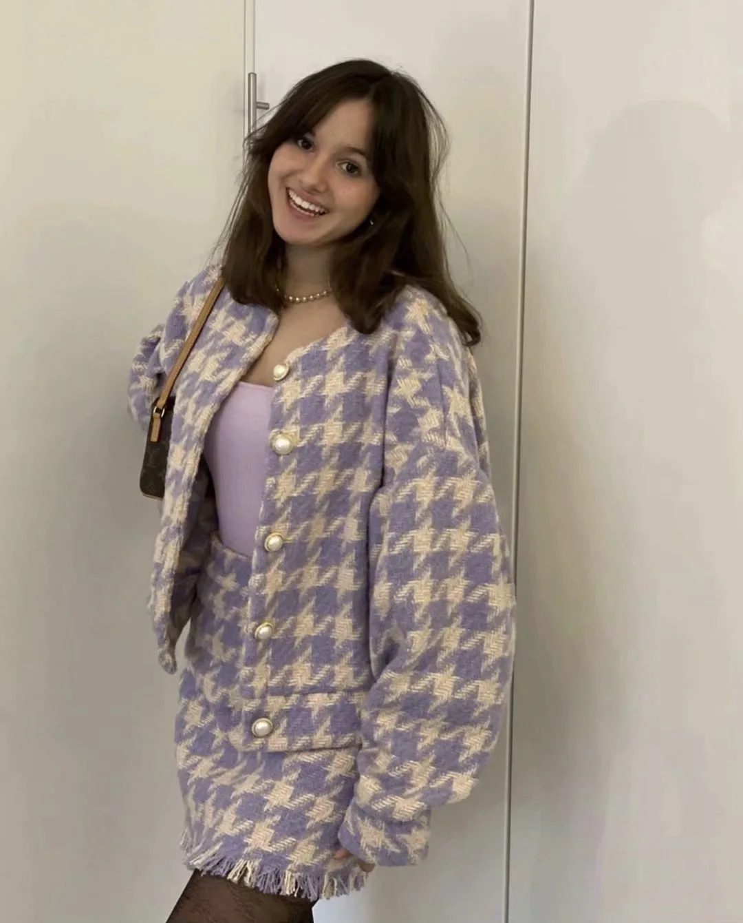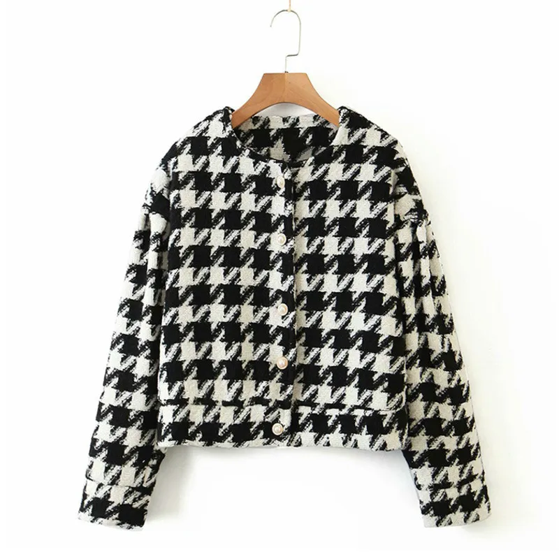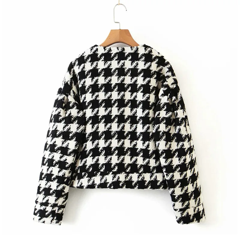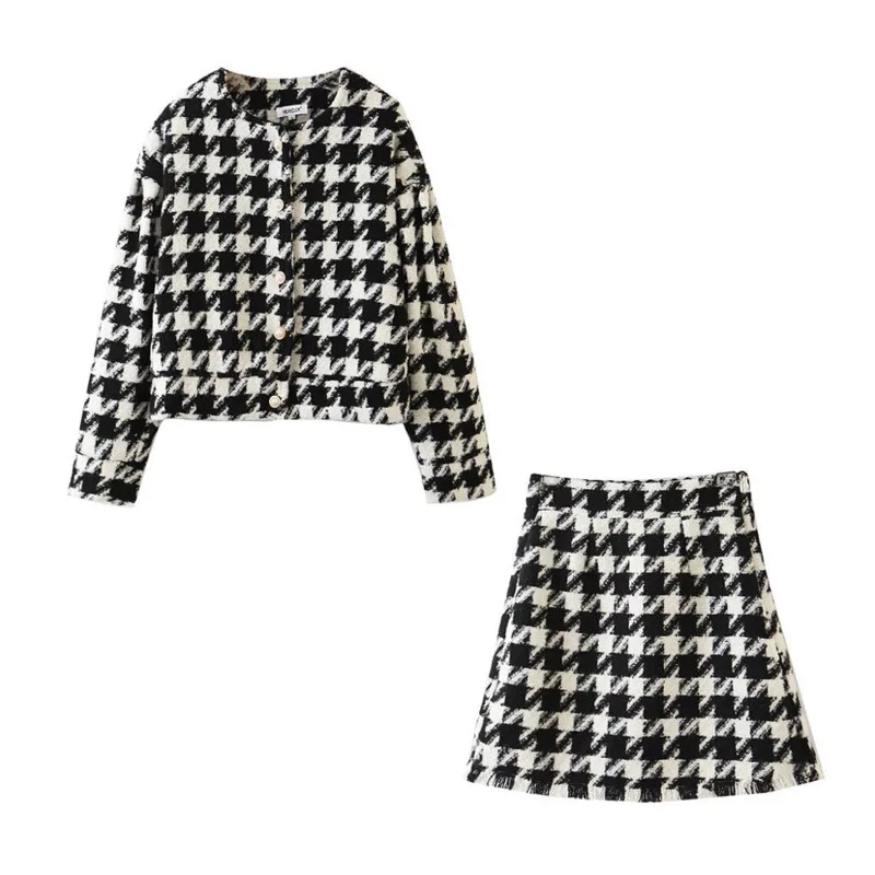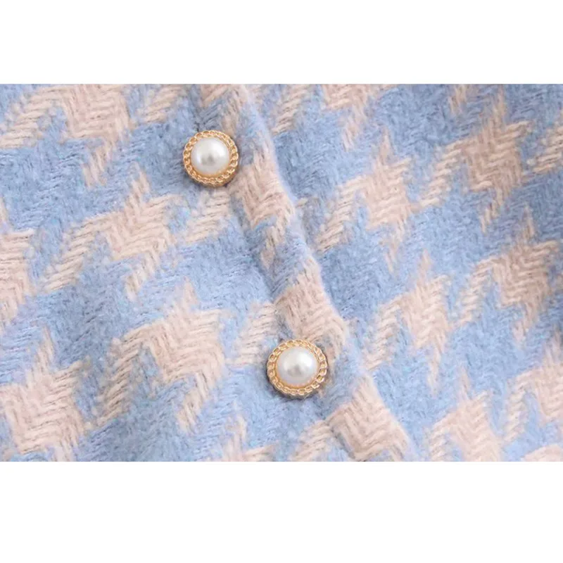 Женский винтажный костюм из 2 предметов, черный клетчатый блейзер в клетку с жемчужными пуговицами, короткая юбка с высокой талией и длинным рукавом